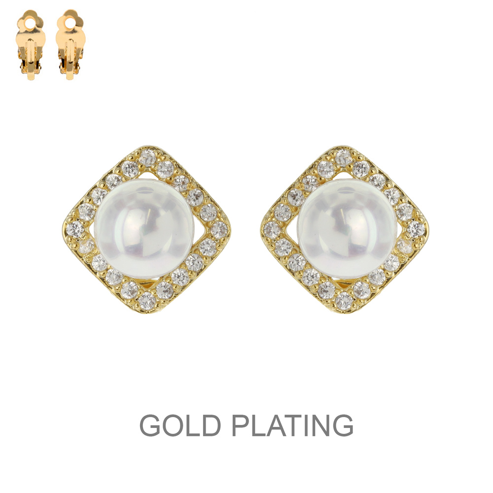 CUBIC GOLD PLATING RHOMBUS WITH PEARL CLIP EARRING