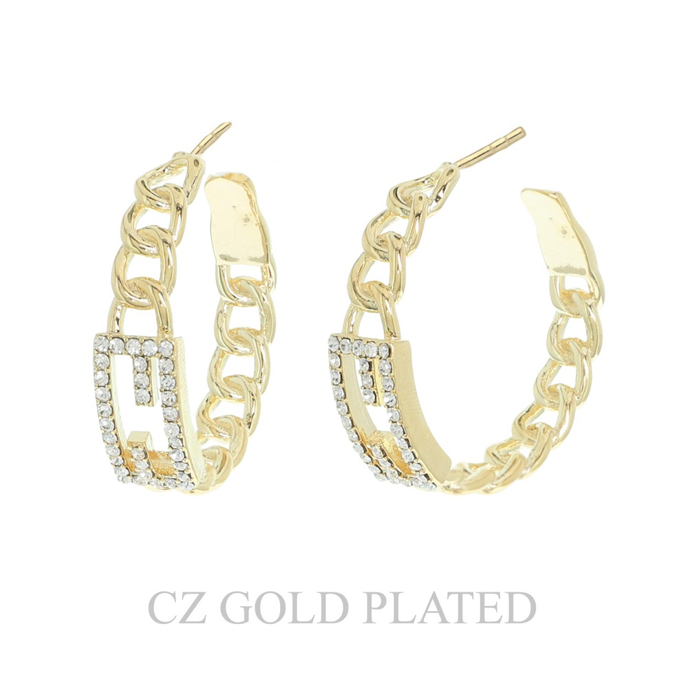 29MM GOLD PLATED CUBIC ZIRCONIA PAVE CHAIN LINK BUCKLE HALF HOOP EARRINGS