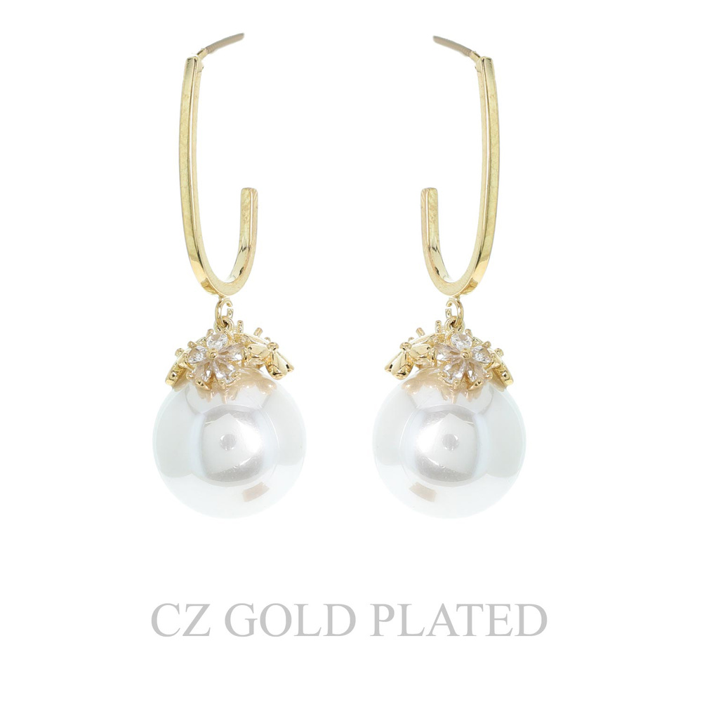 Gold Plated Cz Floral Threader Hoop Pearl Earrings