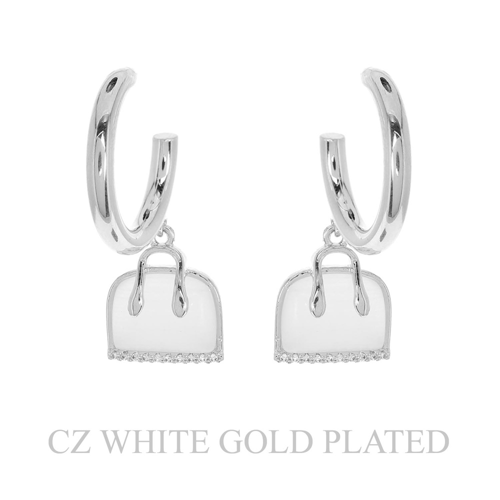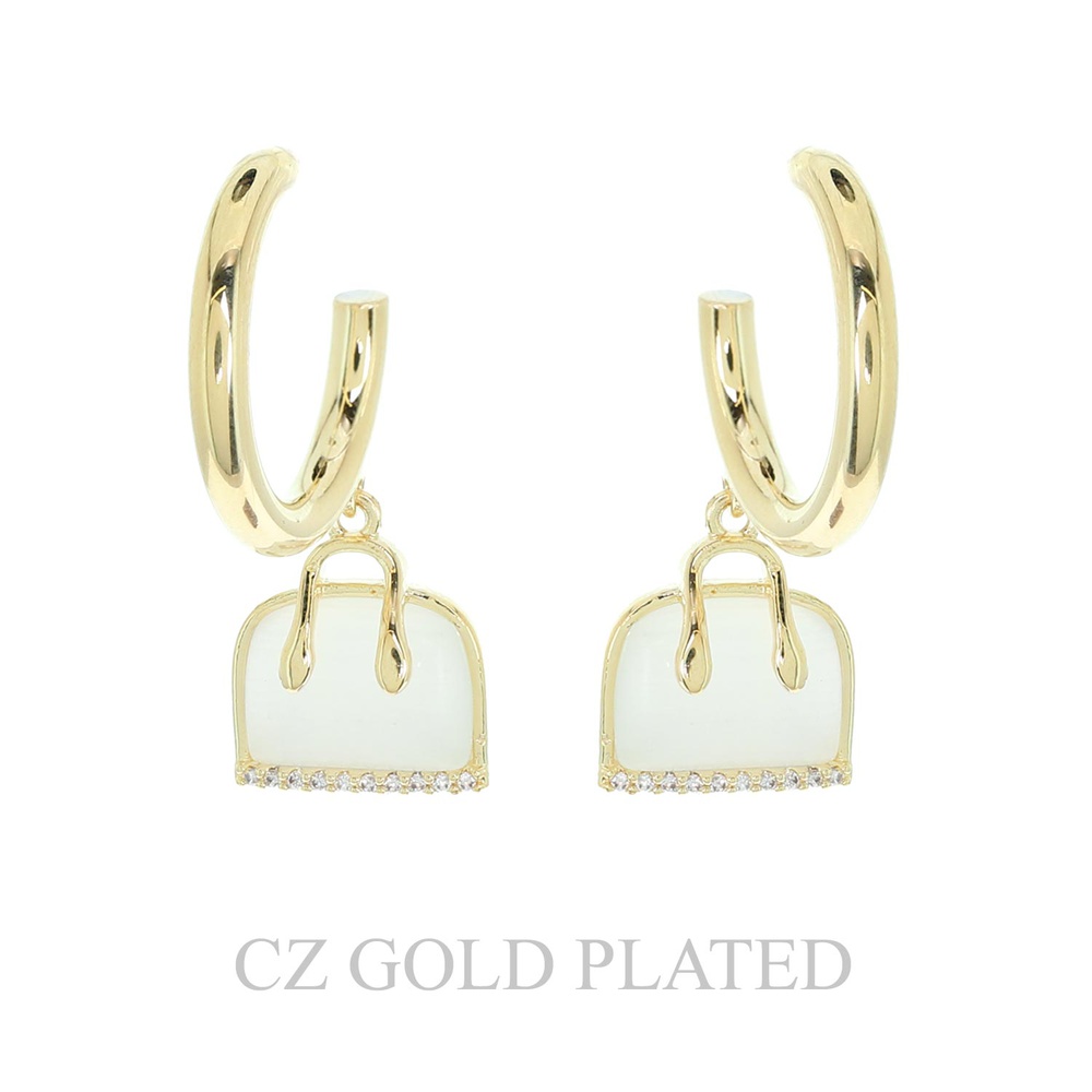 GOLD PLATED CUBIC ZIRCONIA ENAMEL COATED TOP HANDLE PURSE CHARM HOOP EARRINGS
