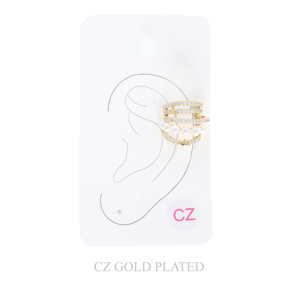 5-ROW CUBIC ZIRCONIA AND PEARL STAR DESIGN EAR CUFF EARRINGS