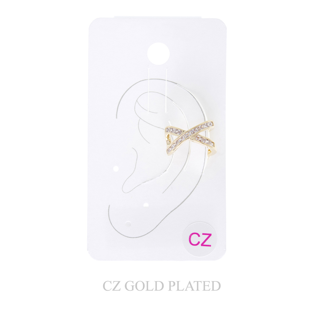 GOLD PLATED CUBIC ZIRCONIA CRISS CROSS EAR CUFF EARRINGS IN YELLOW GOLD PLATTING