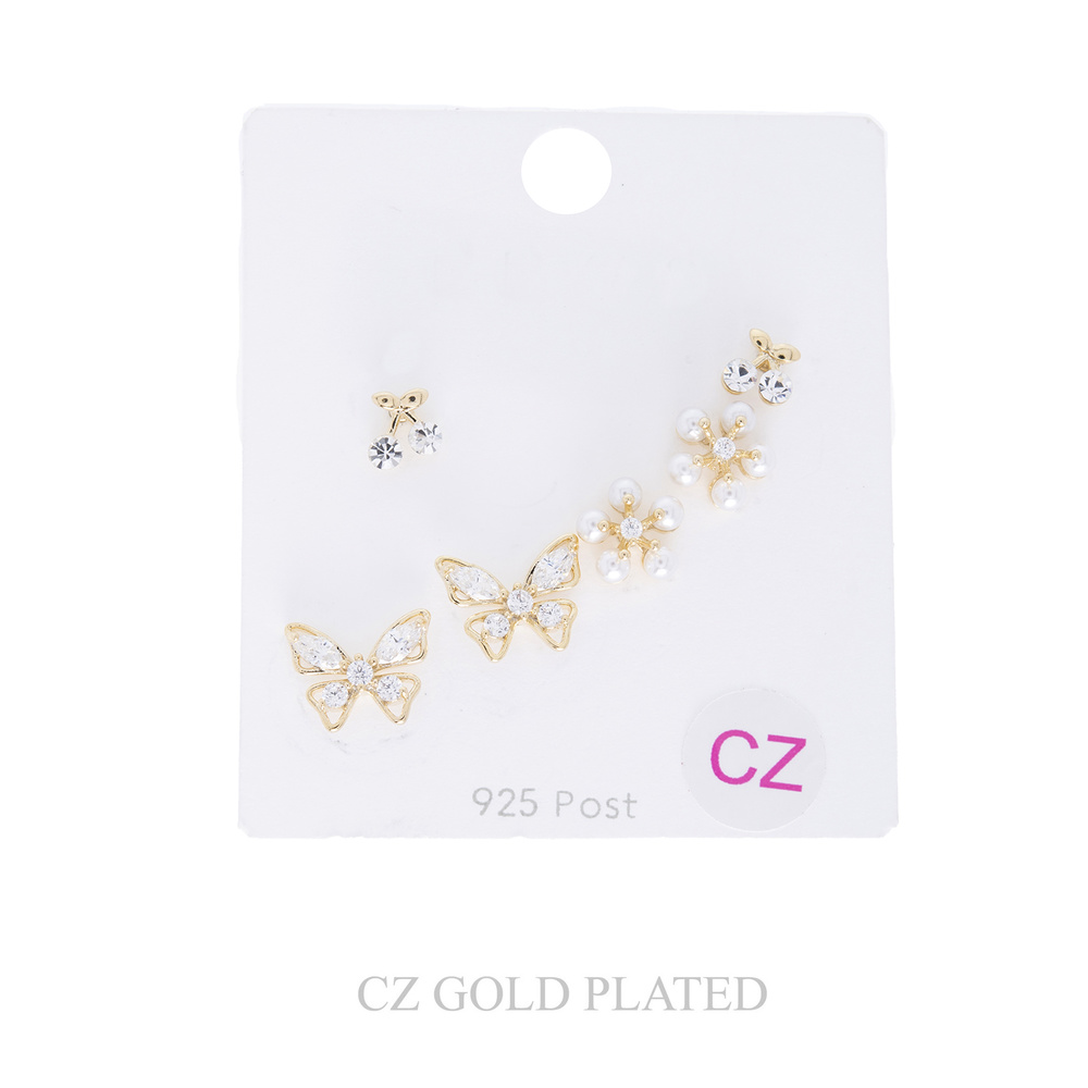 3-PAIR GOLD PLATED CUBIC ZIRCONIA AND PEARL .925 STERLING SILVER POST ASSORTED STUD EARRING SET IN WHITE GOLD PLATTING