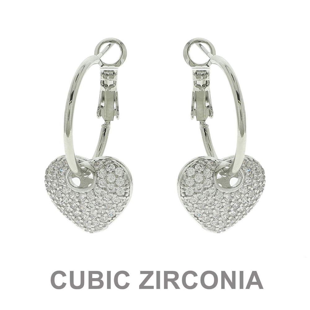PUFFY CUBIC ZIRCONIA PAVE HEART HOOP DANGLE EARRINGS