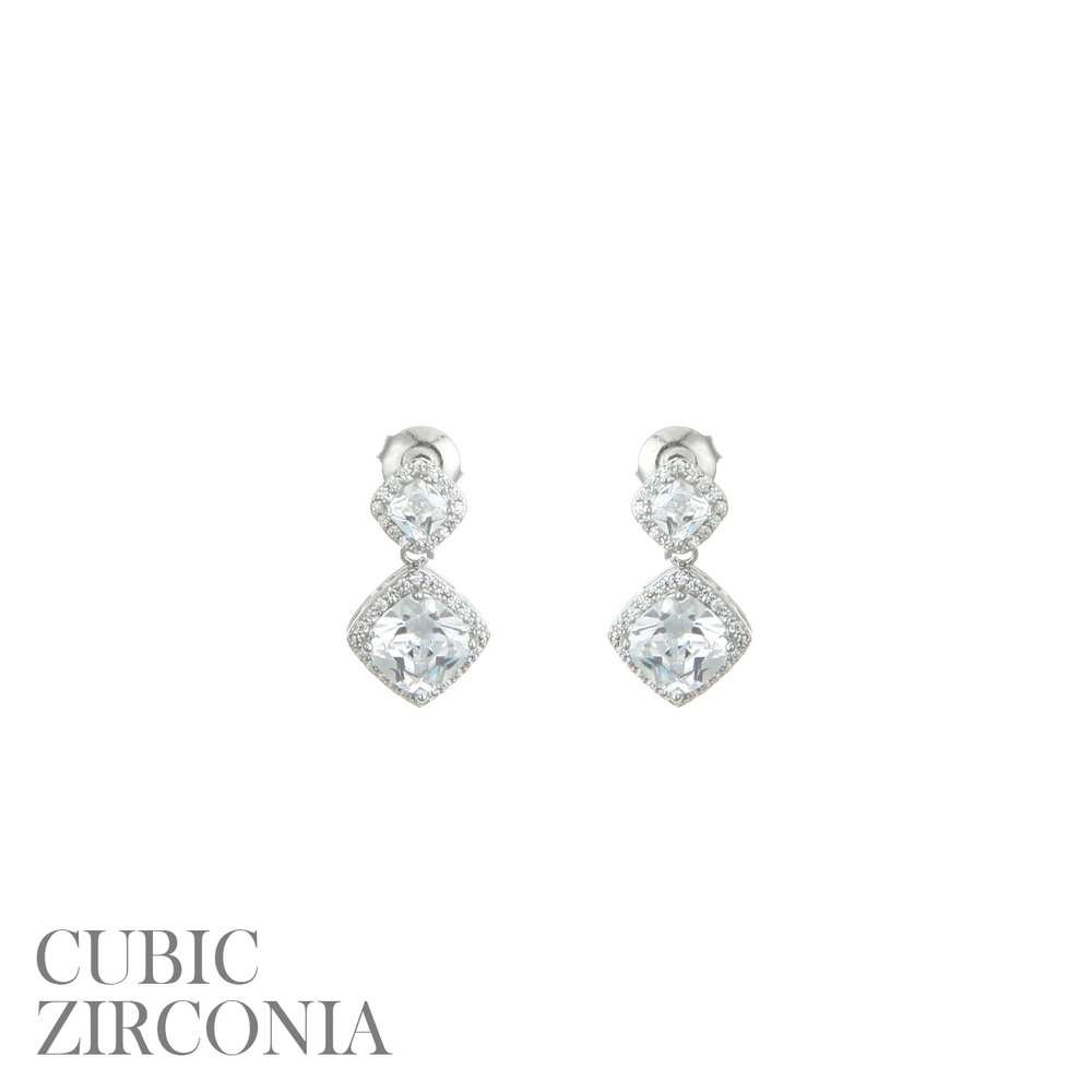 CUBIC ZIRCONIA SOUBLE DQUARE POST EARRING IN SILVER-TONE METAL