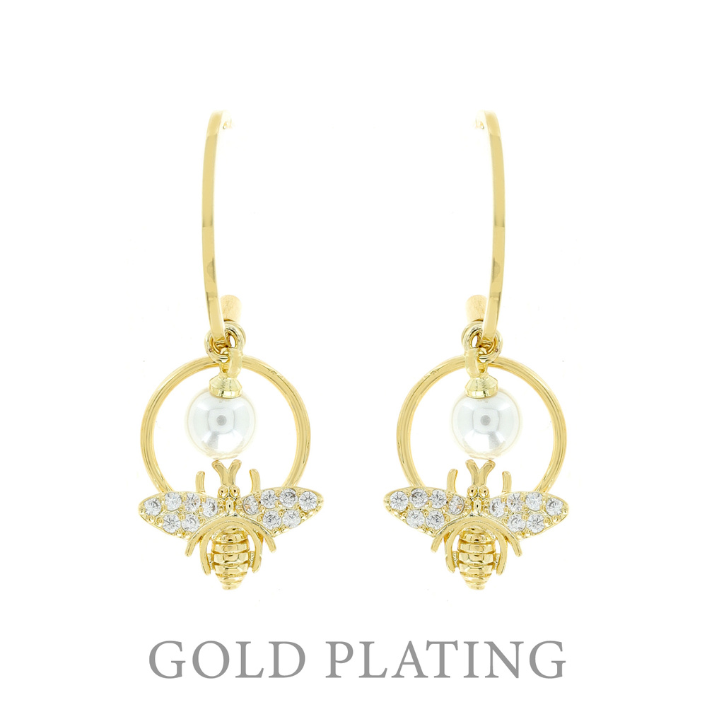 CUBIC ZIRCONIA CZ WHITE GOLD PLATED BEE WITH PEARL DROP HALF HOOP EARRINGS