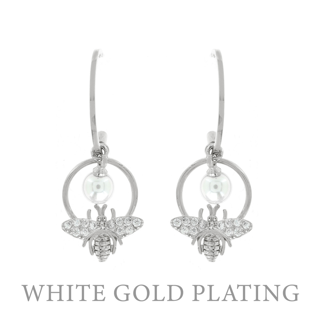 Cubic Zirconia Cz White Gold Plated Bee With Pearl Drop Half Hoop Earrings