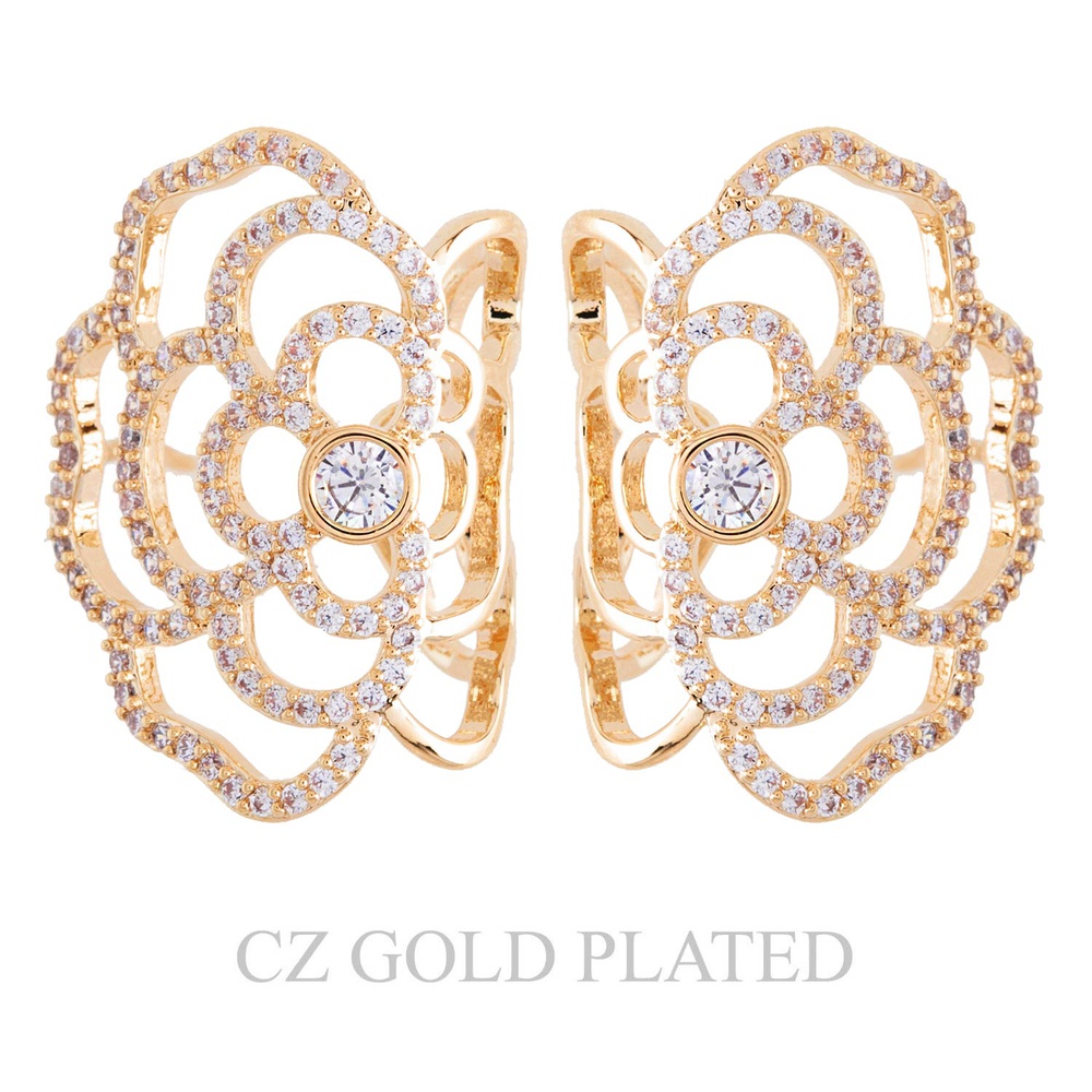 GOLD PLATED CUBIC ZIRCONIA FLORAL FILIGREE EARRINGS IN YELLOW GOLD PLATTING