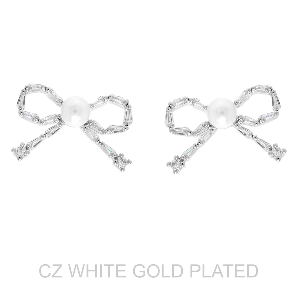 PEARL CUBIC ZIRCONIA EMBELLISHED BOWKNOT POST EARRINGS