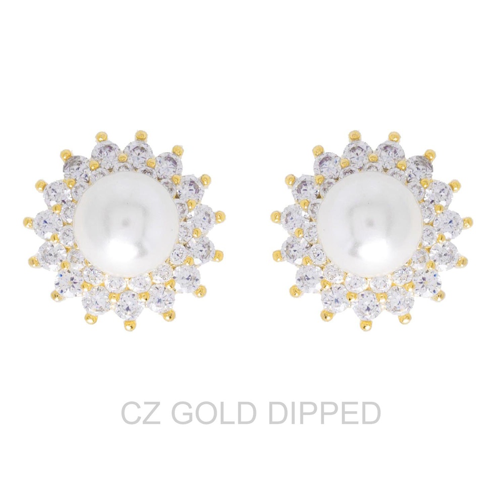 GOLD DIPPED CUBIC ZIRCONIA PEARL SUNBURST HALO DROP EARRINGS