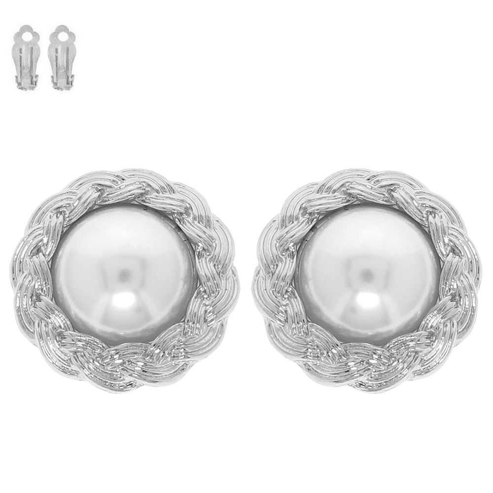 CLIP ON EARRINGS WITH PEARL CENTER AND BRAIDED METAL TRIM