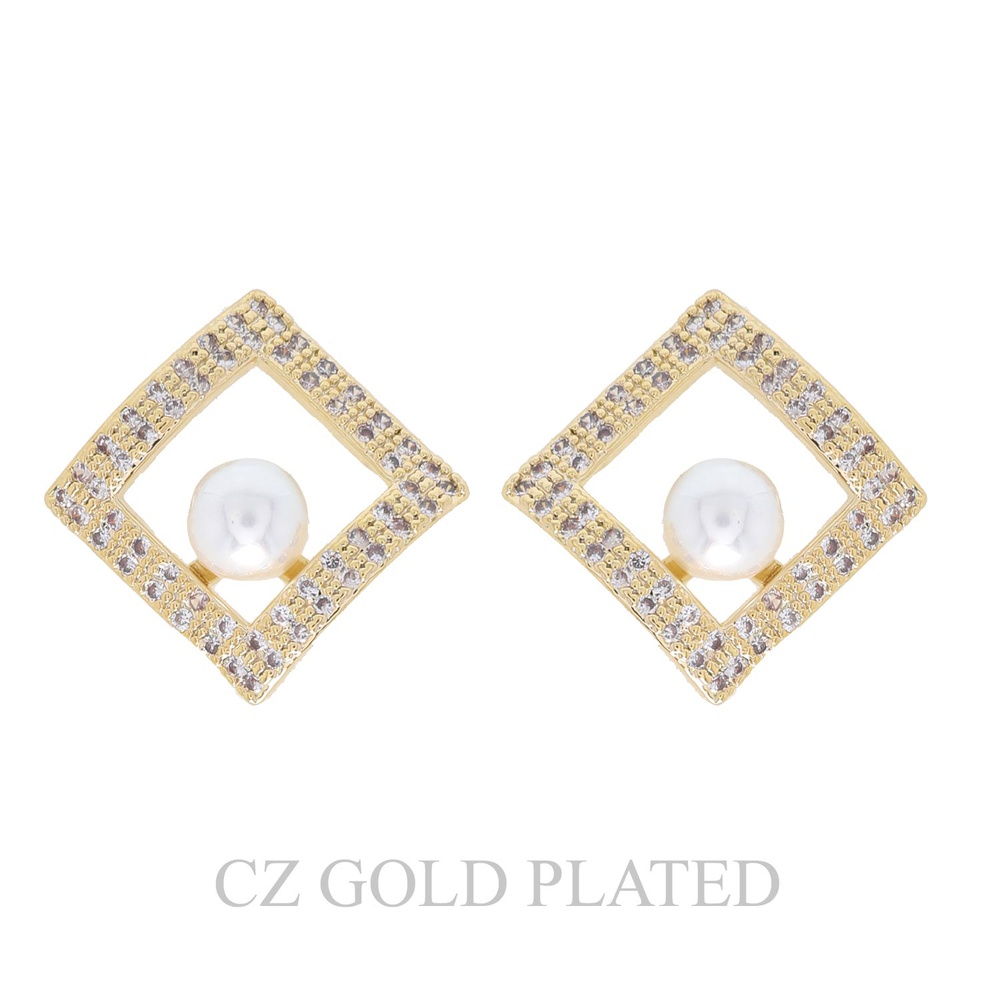 GOLD PLATED CUBIC ZIRCONIA PEARL OPEN DIAMOND SHAPED STUD EARRINGS