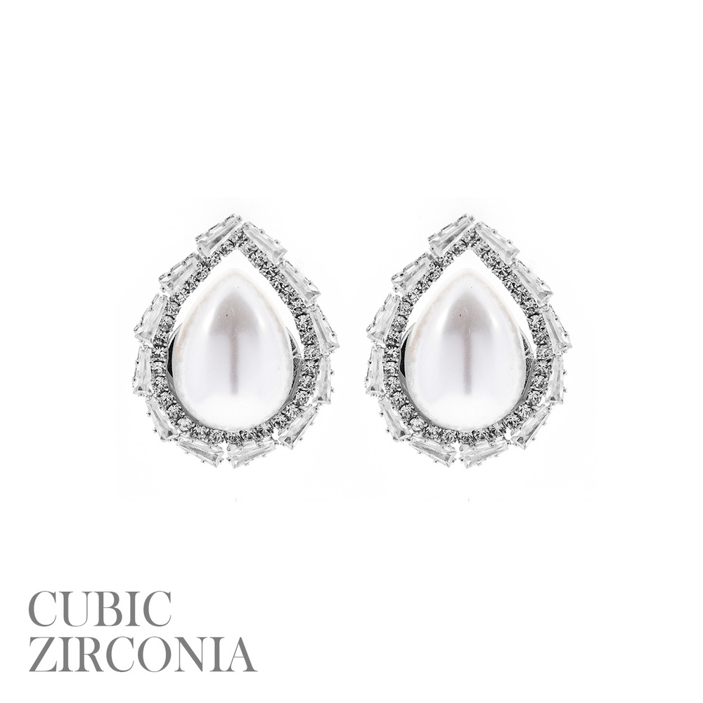 CUBIC ZIRCONIA BEZELED DROP-SHAPED PEARL POST EARRINGS IN SILVER-TONE METAL