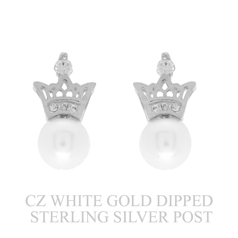 Gold Plated Cz Pave Royal Crown Pearl Earrings