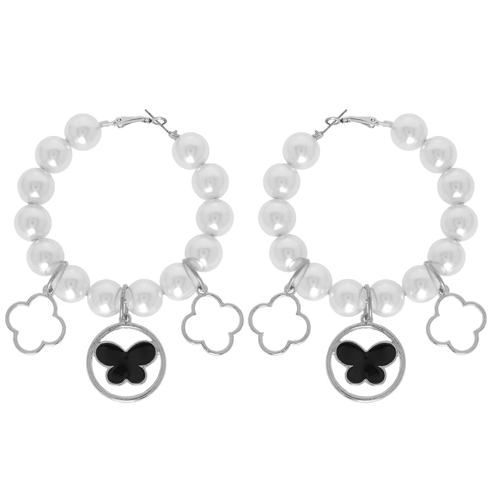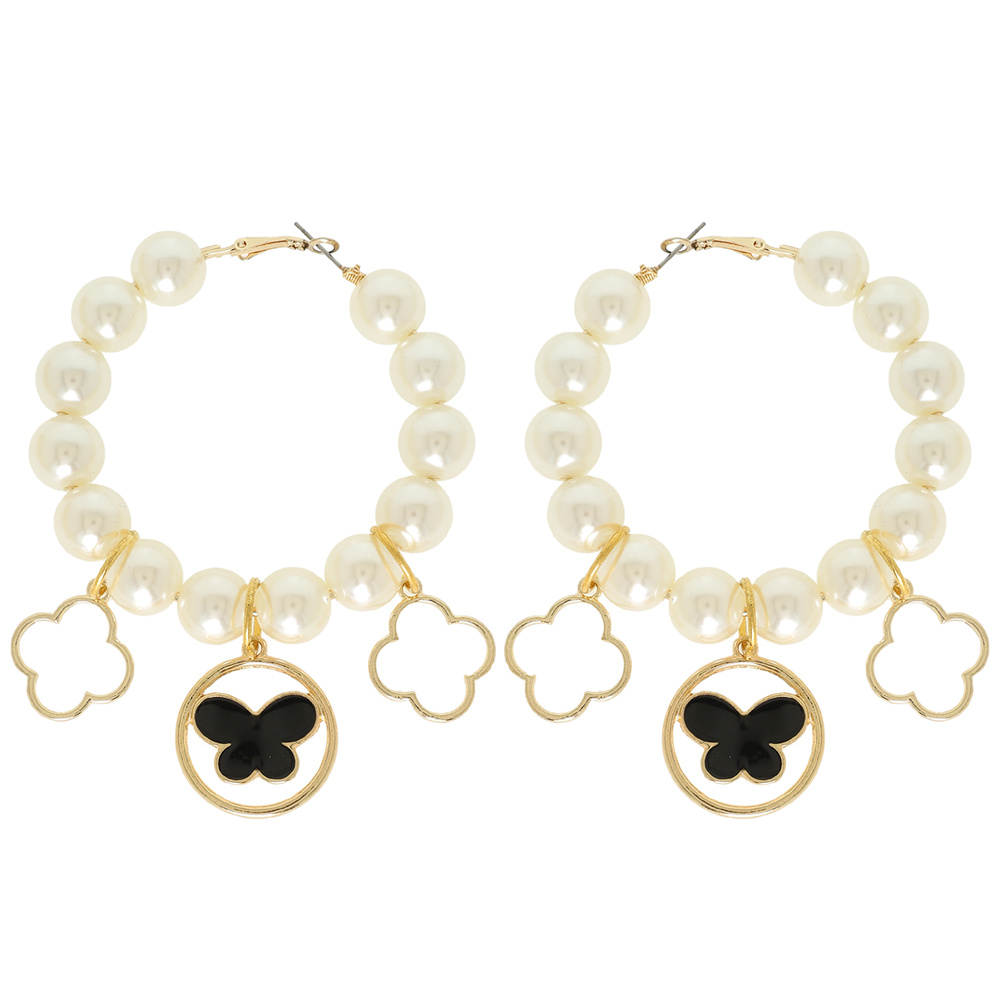 FASHIONISTA BUTTERFLY QUATREFOIL OPEN CHARM PEARL HOOP EARRINGS WITH LEVERBACK CLOSURE