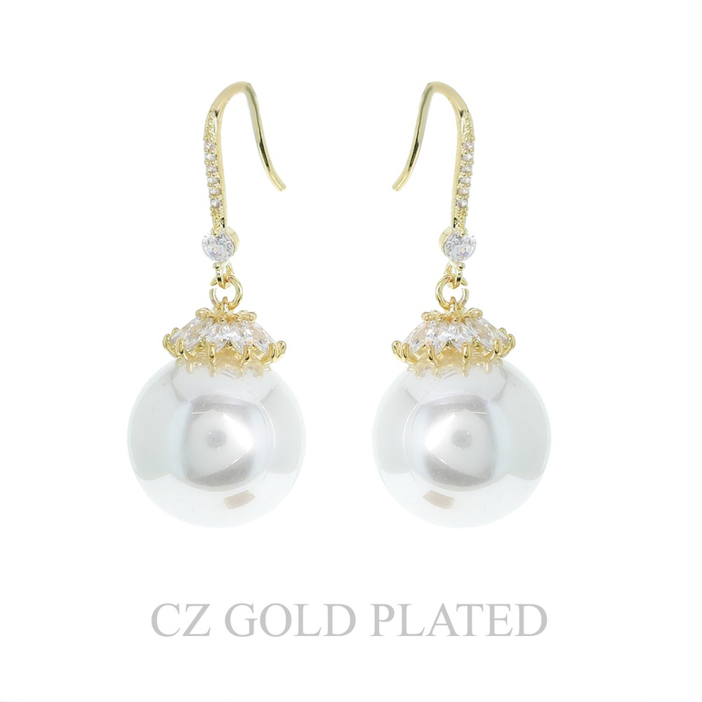 Gold Plated Cz Cap Pearl Fish Hook Earrings