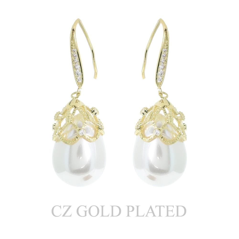GOLD PLATED CUBIC ZIRCONIA LATTICE CAP PEARL FISH HOOK EARRINGS