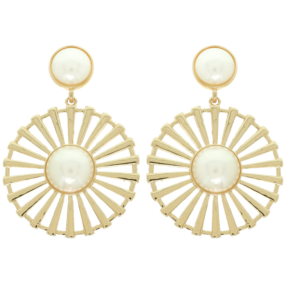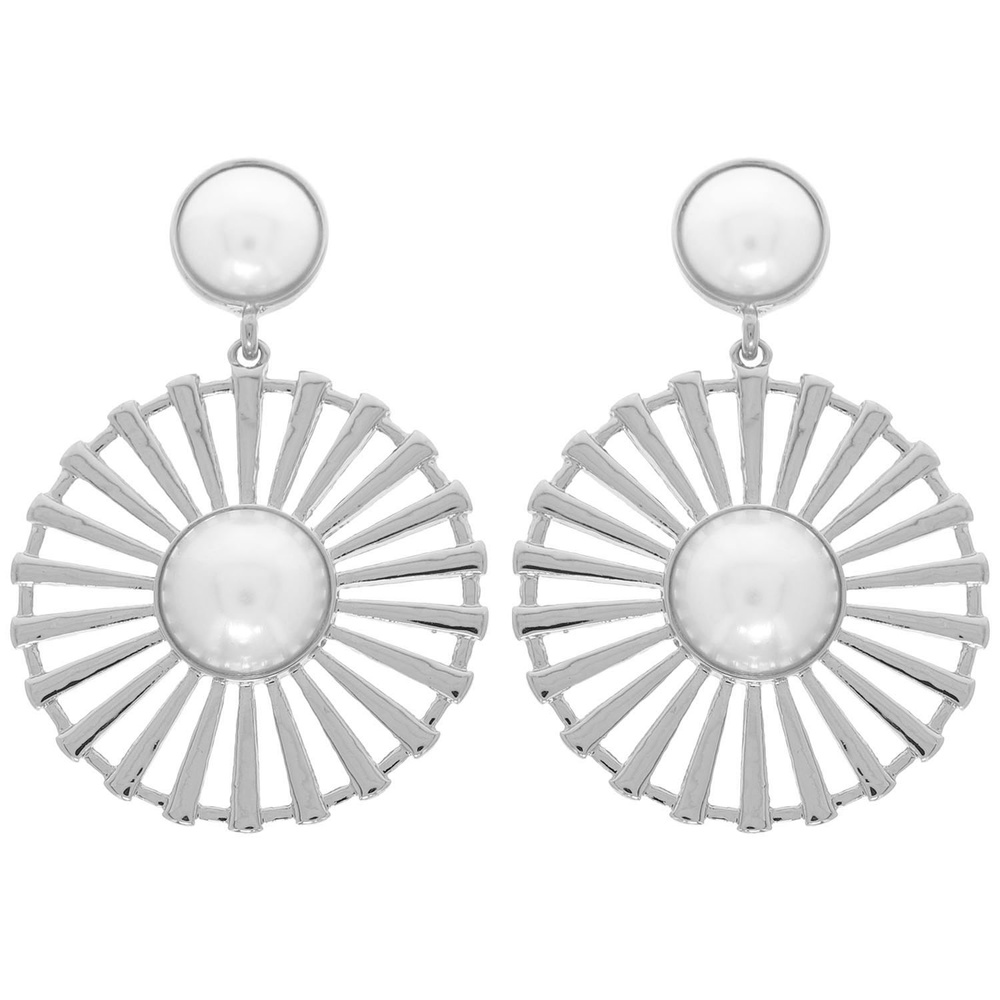 RADIAL PATTERN FLORAL PEARL BEZEL-SET POST DANGLE EARRINGS IN SILVER-TONE METAL
