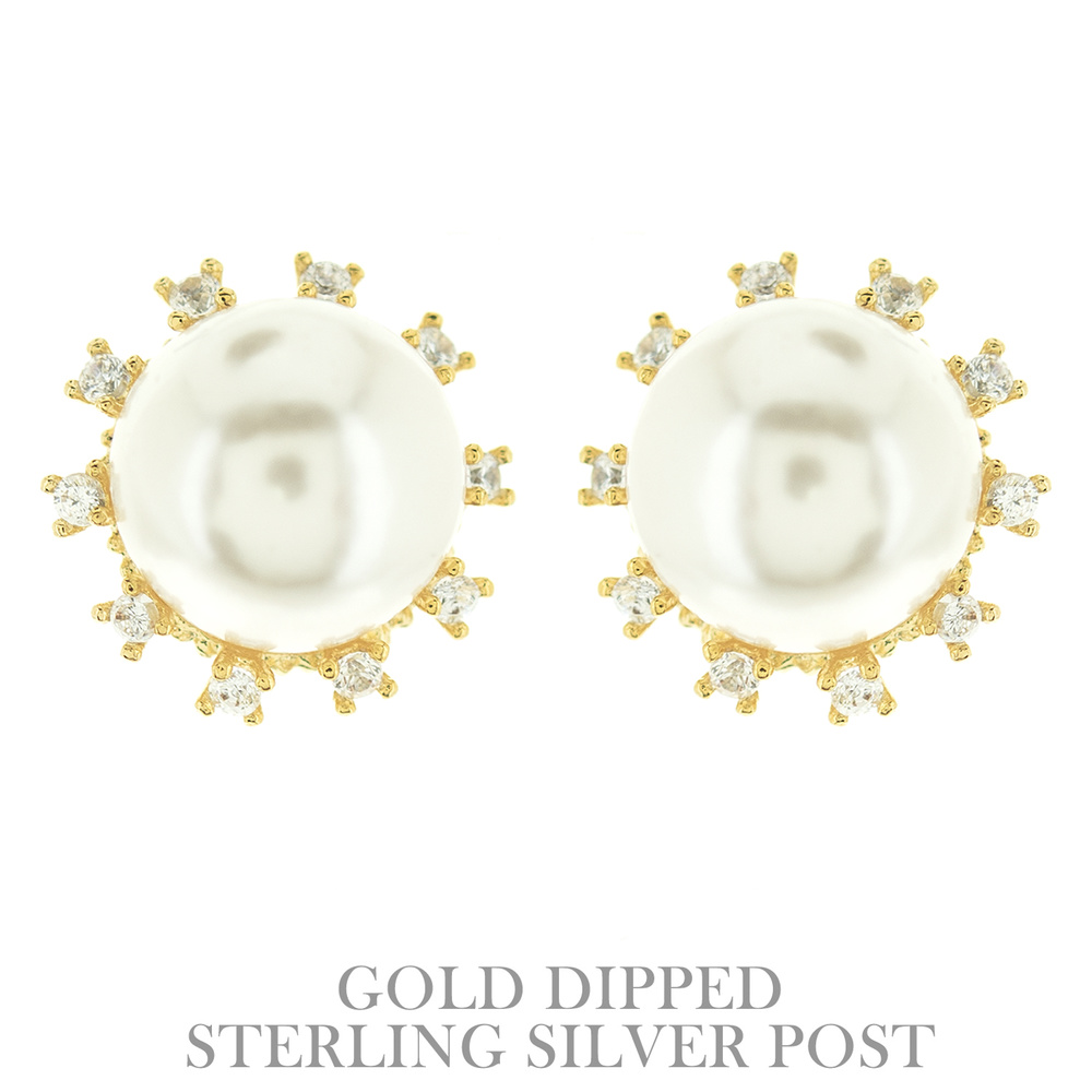 GOLD DIPPED CUBIC ZIRCONIA & SYNTHETIC PEARL SUNBURST HALO STERLING SILVER POST DROP EARRINGS