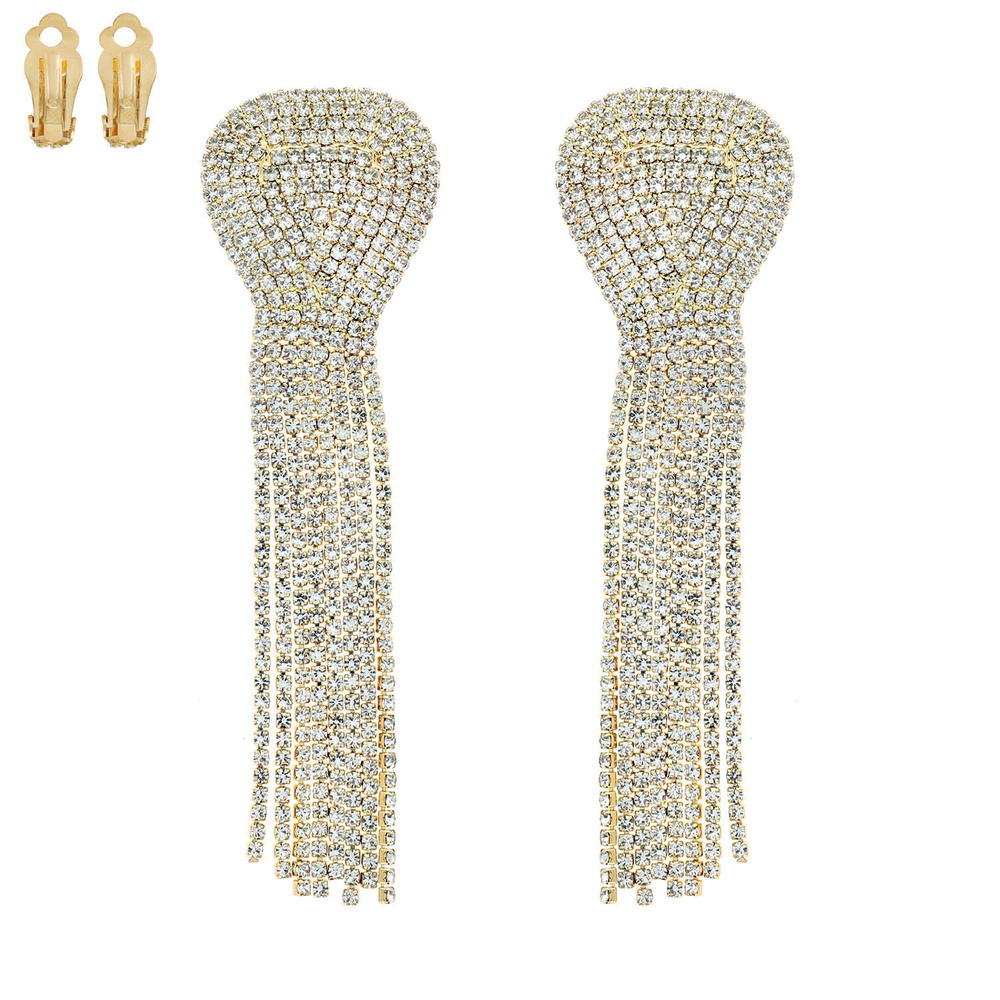 Statement Crystal Rhinestone Tassel Clip On Long Drop Earrings