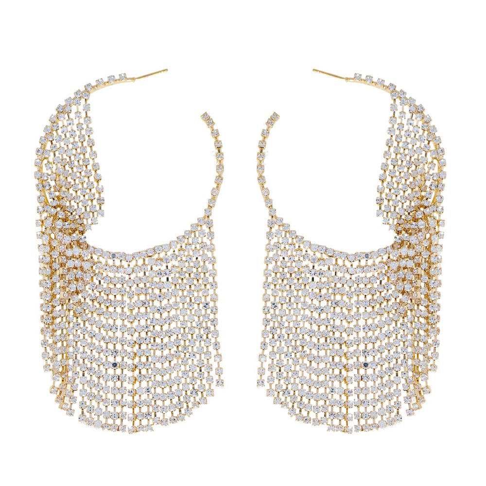 CRYSTAL RHINESTONE TASSEL LONG DROP HOOP EARRINGS