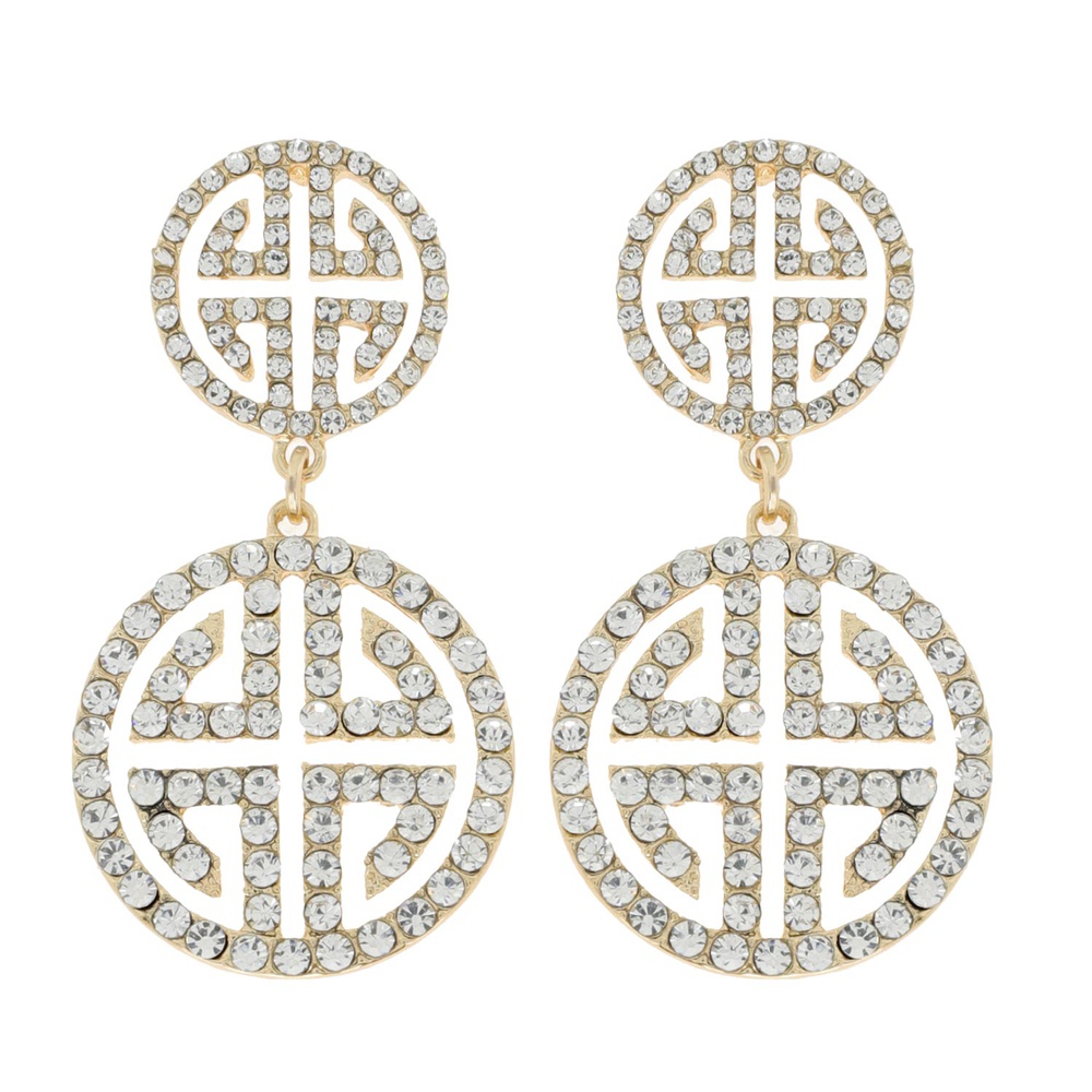 FASHIONISTA 2-TIER GREEK KEY SQUARE CRYSTAL RHINESTONE DOUBLE DISC DANGLE AND DROP EARRINGS