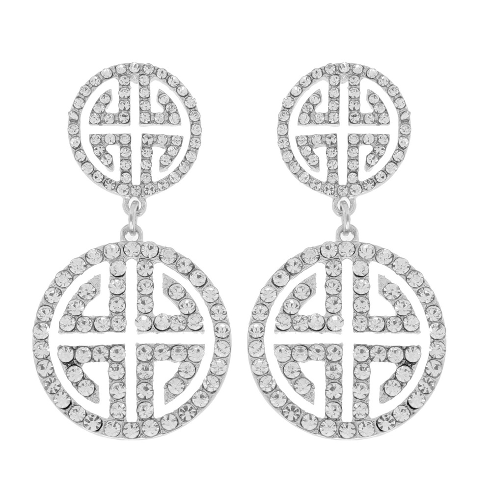 Fashionista 2-tier Greek Key Square Crystal Rhinestone Double Disc Dangle And Drop Earrings