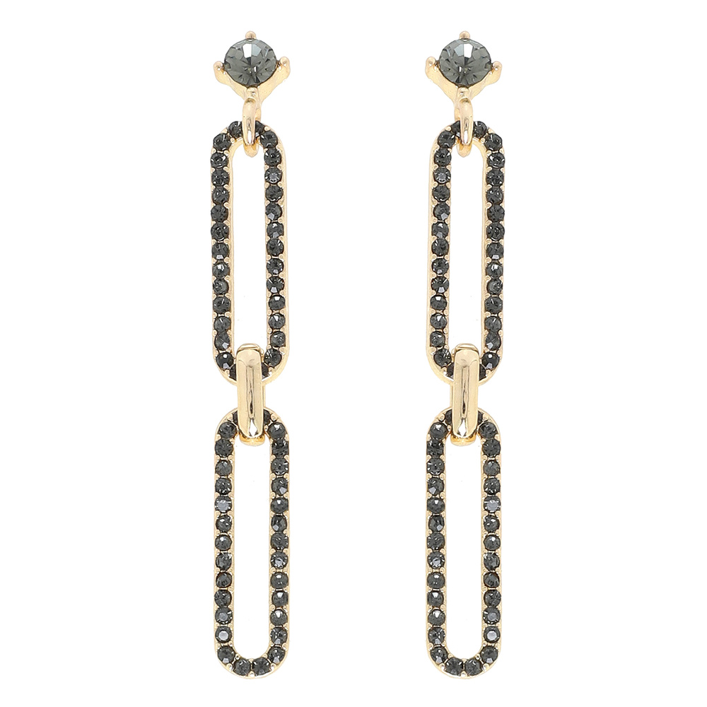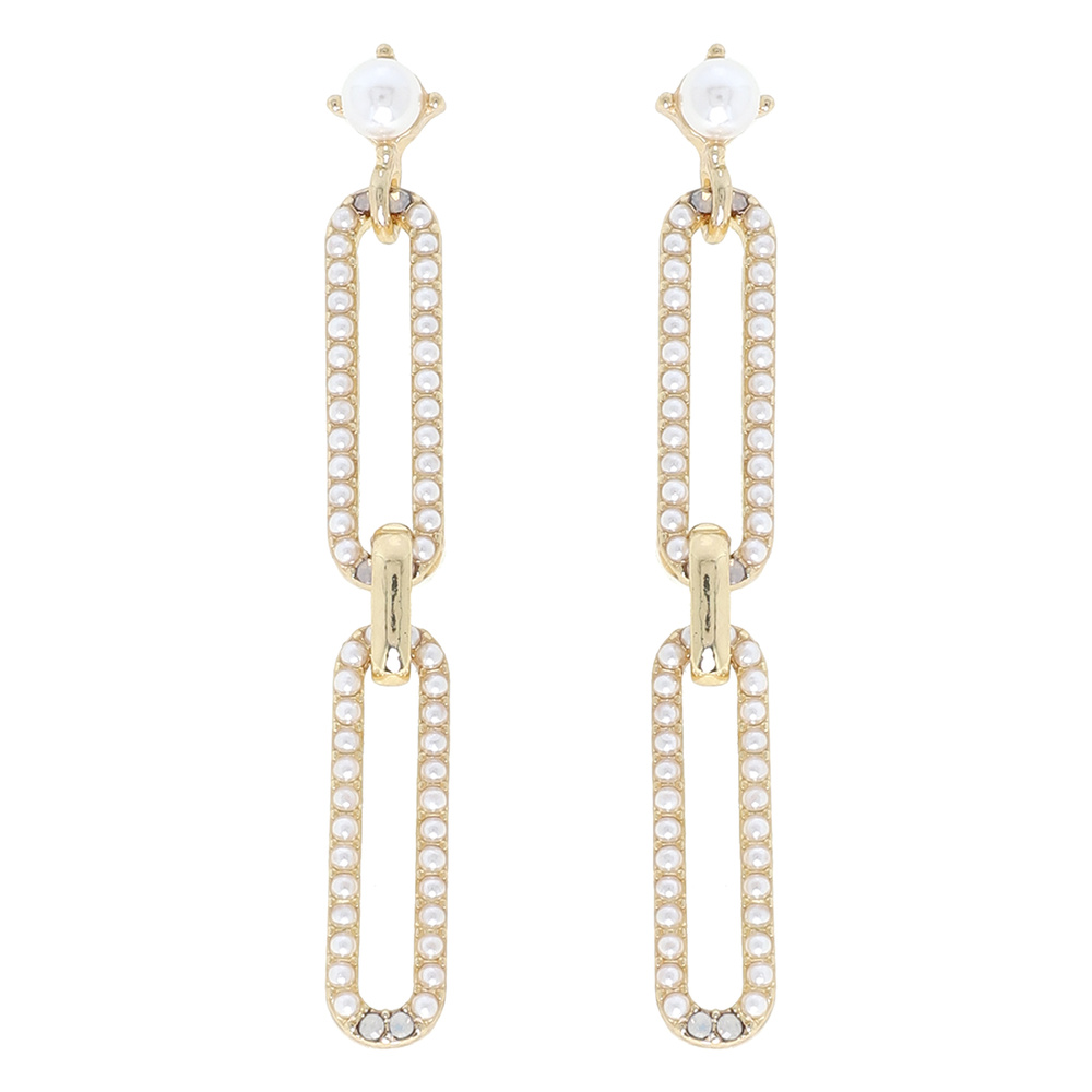 3-TIER CRYSTAL RHINESTONE PAVE OR WHITE PEARL PAPERCLIP LINK DANGLE AND DROP EARRINGS IN GOLD TONE METAL