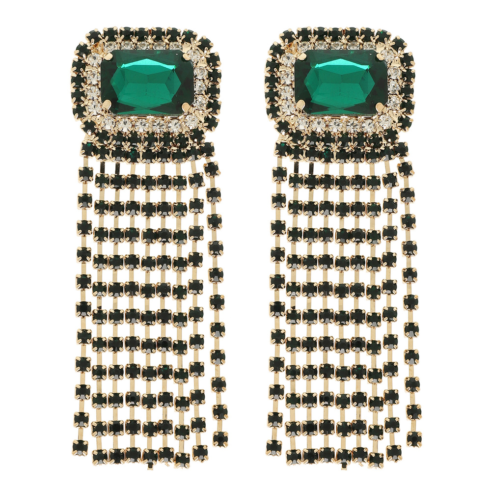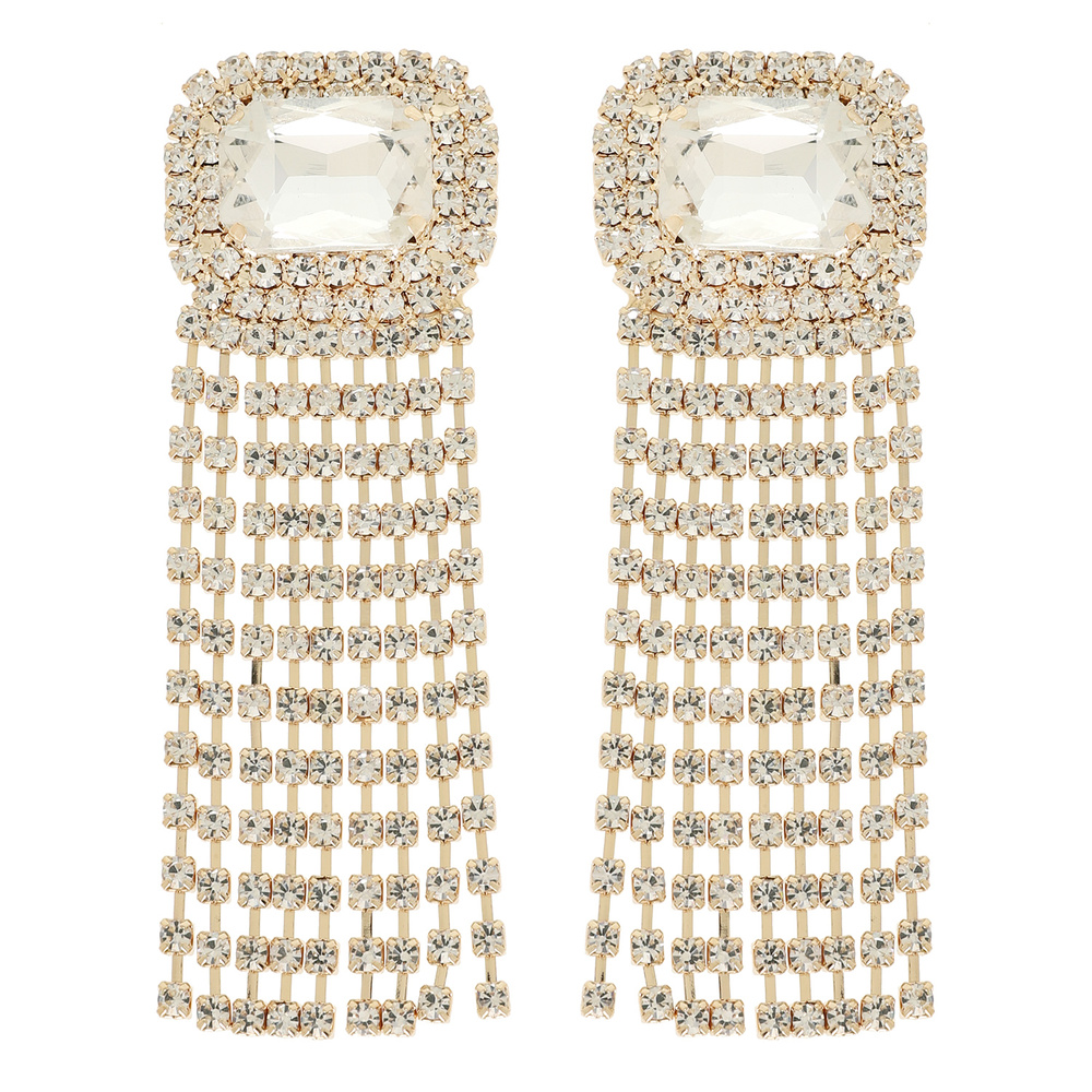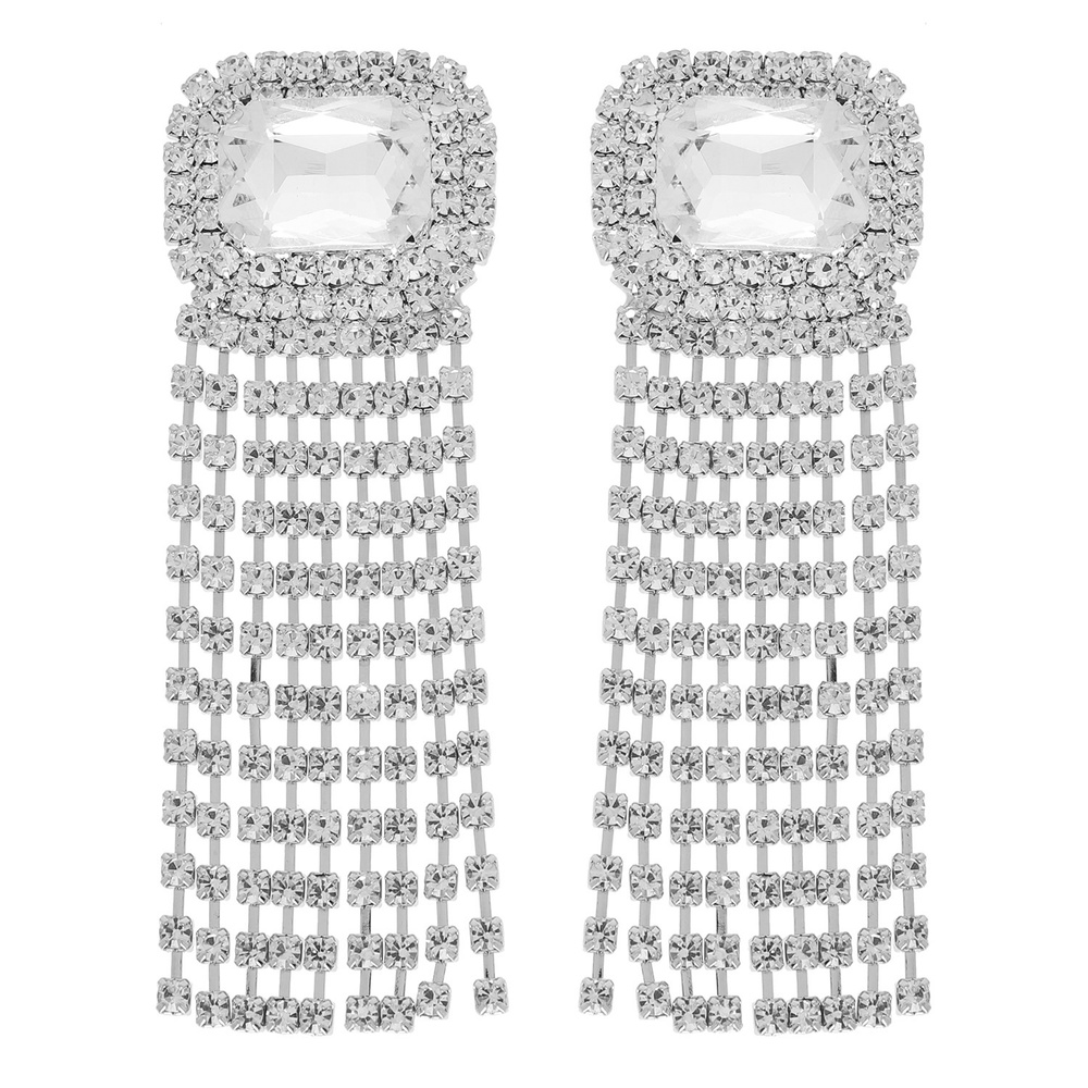 TWO-TIER RHINESTONE PAVE EMERALD-CUT CRYSTAL FRINGE POST EARRINGS