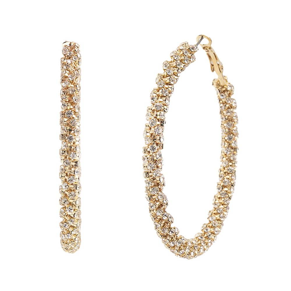 RHINESTONE PAVE TUBE HOOP EARRINGS WITH OMEGA BACK CLOSURE IN GOLD-TONE METAL