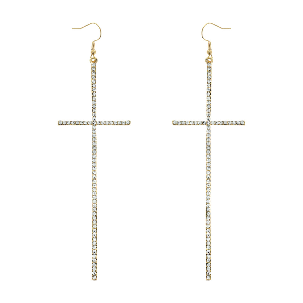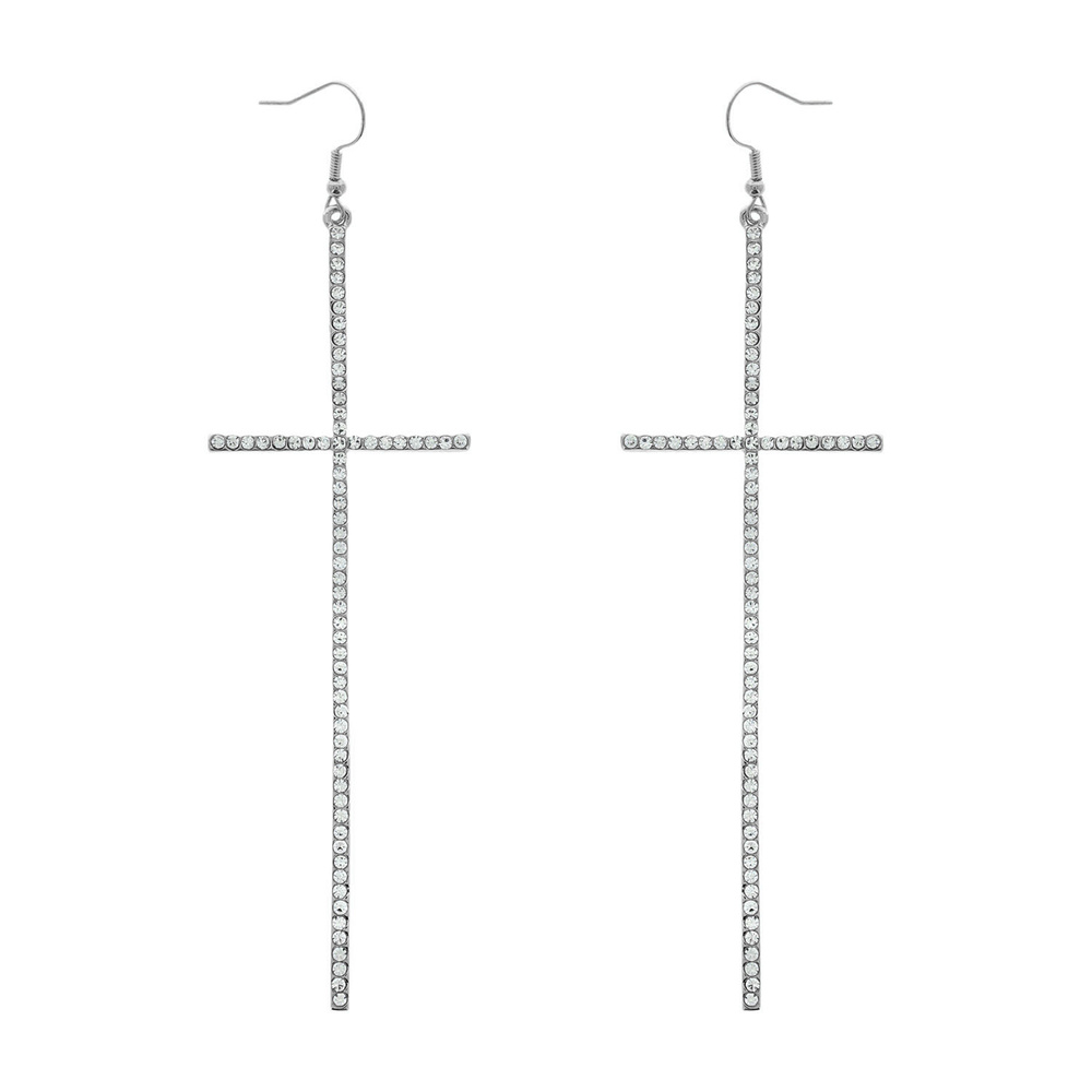 LONG RHINESTONE PAVE CROSS DROP EARRINGS IN SILVER AND GOLD TONE - STATEMENT RELIGIOUS SPIRITUAL CHRISTIAN JEWELRY