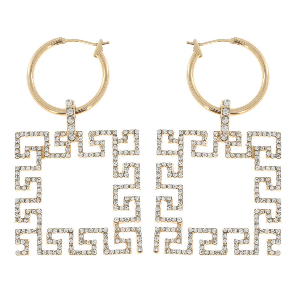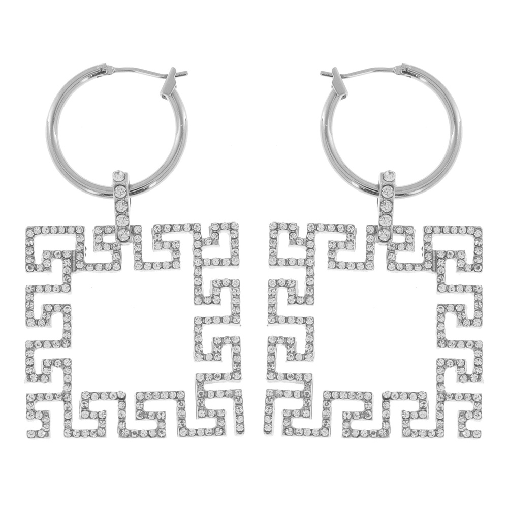 Crystal Rhinestone Pave Greek Key Pattern Charm Hoop Earrings
