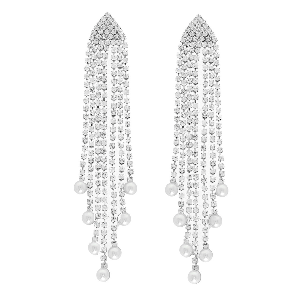 TRIANGLE CRYSTAL RHINESTONE SIMULATED PEARL TASSEL LONG DROP EARRINGS