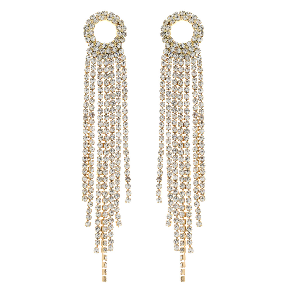 CRYSTAL RHINESTONE OPEN CIRCLE LONG DROP TASSEL EARRINGS