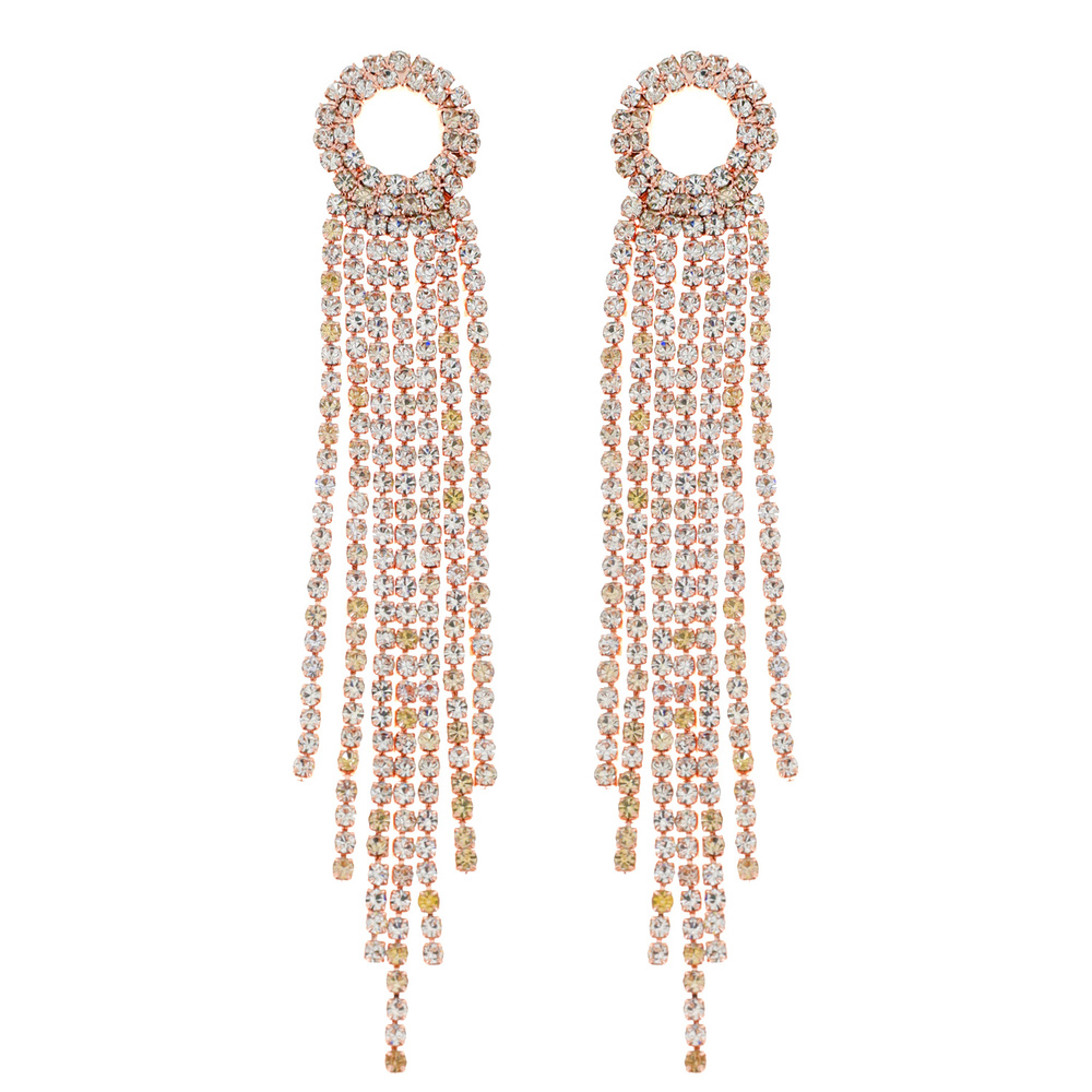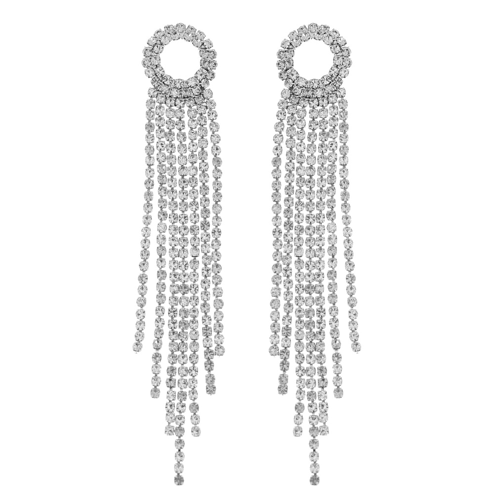 Crystal Rhinestone Open Circle Long Drop Tassel Earrings
