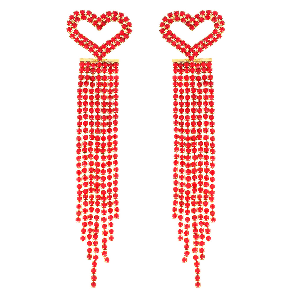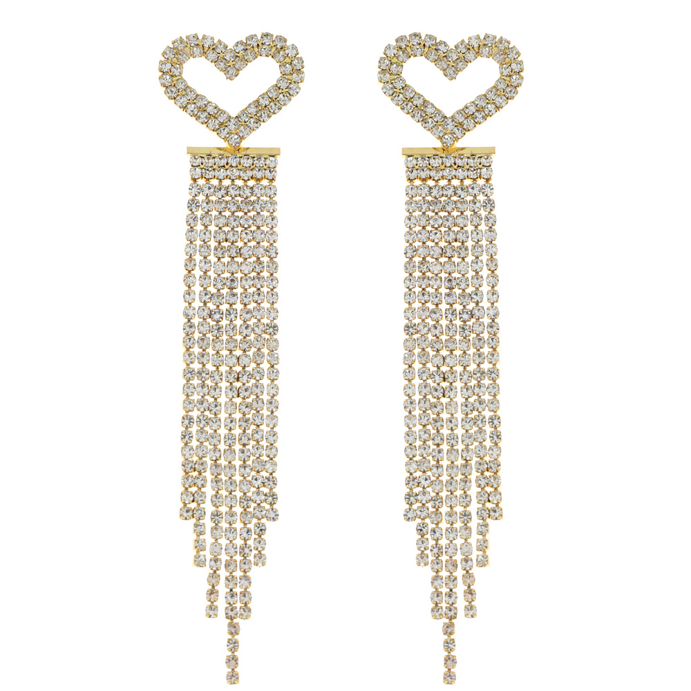 2-TIER CRYSTAL RHINESTONE OPEN HEART LONG DROP TASSEL EARRINGS