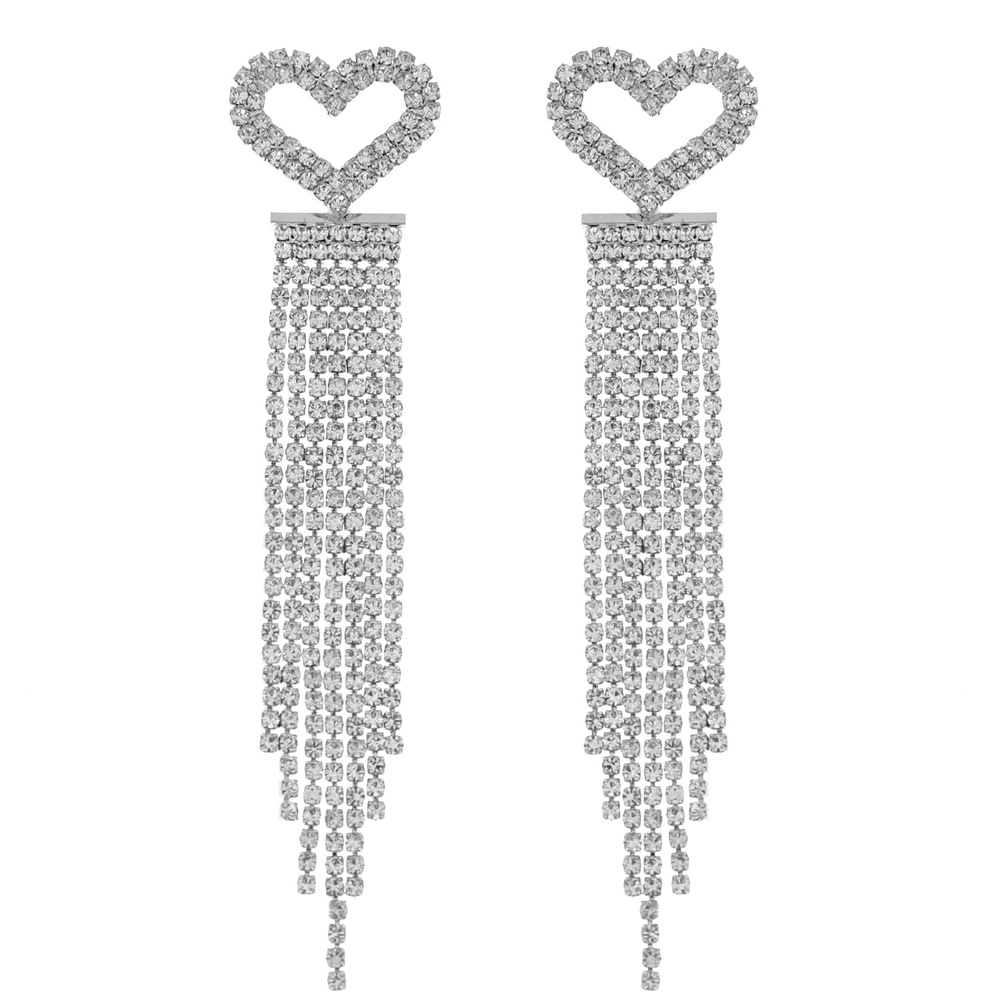 2-tier Crystal Rhinestone Open Heart Long Drop Tassel Earrings