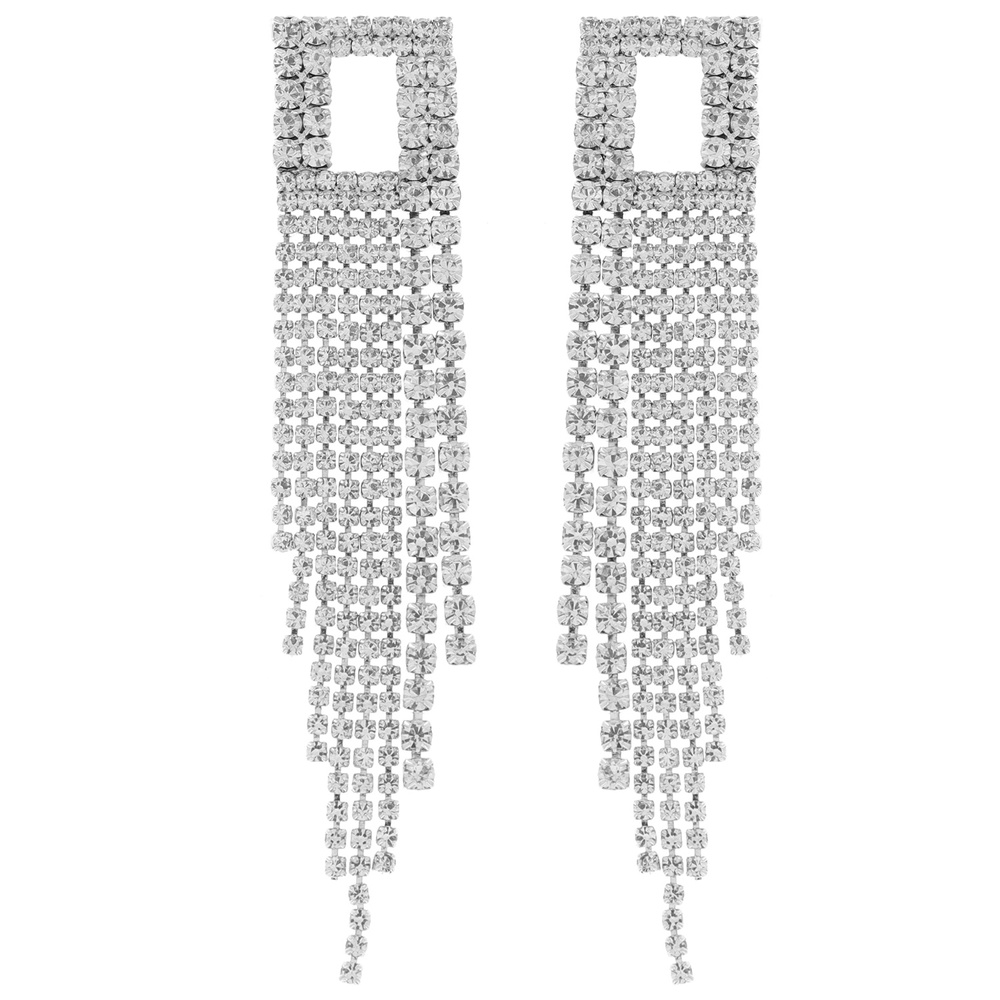 OPEN RECTANGLE TASSEL LONG DROP CRYSTAL EARRINGS
