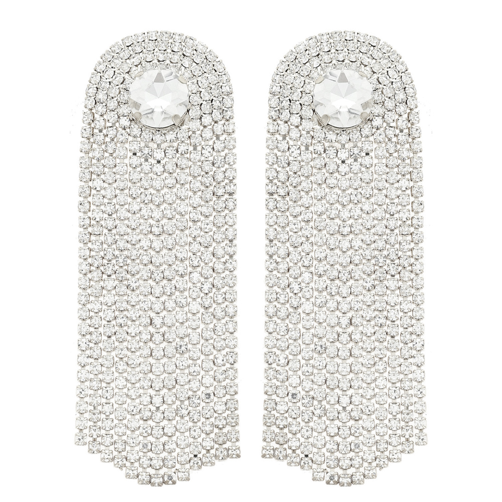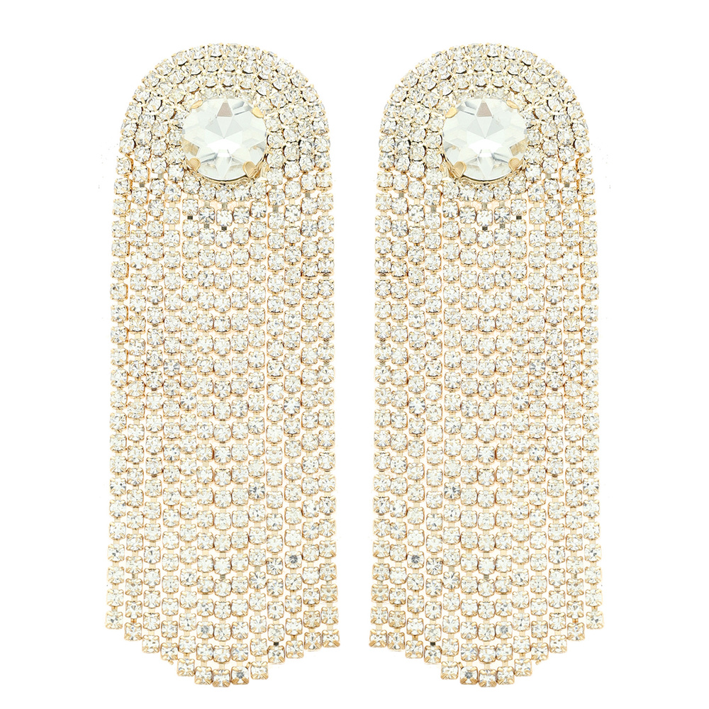 Crystal Rhinestone Center Stone Arched Tassel Long Drop Earrings