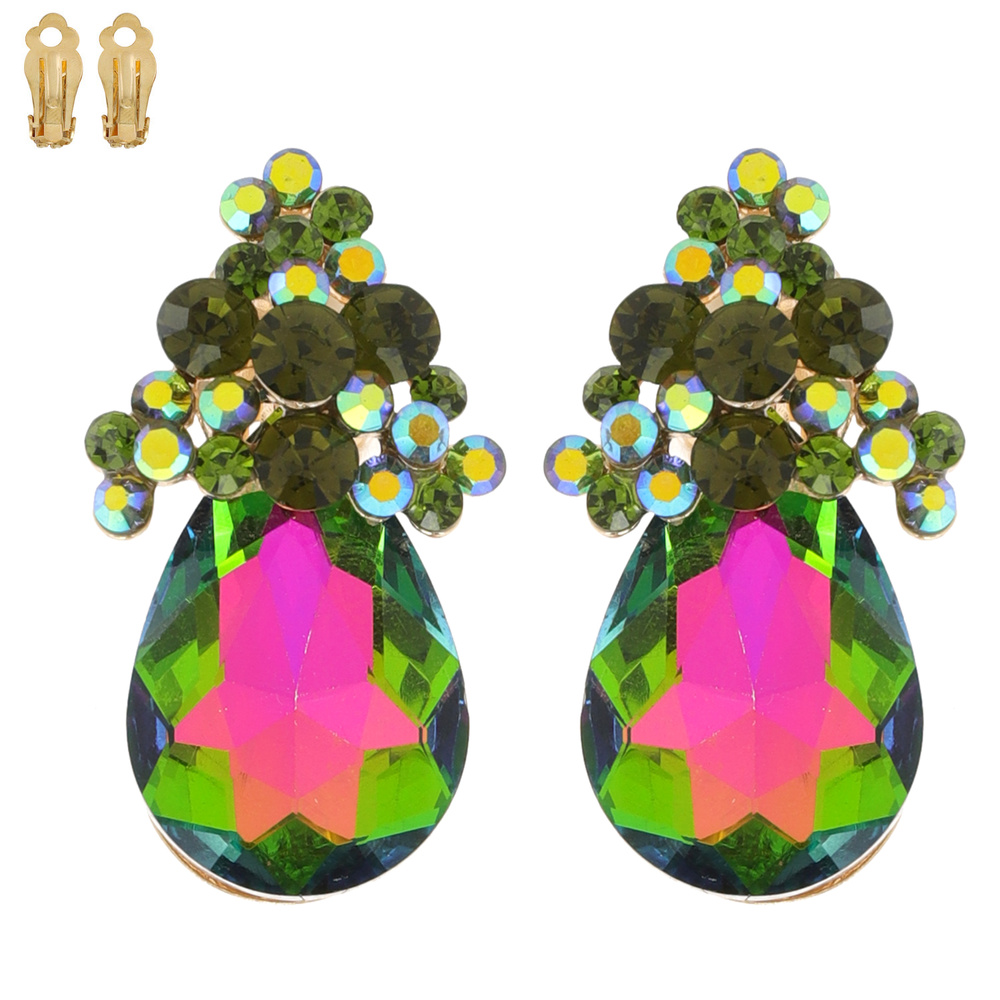 Crystal Cluster Teardrop Clip On Earrings In Gold And Silver Tone Metal