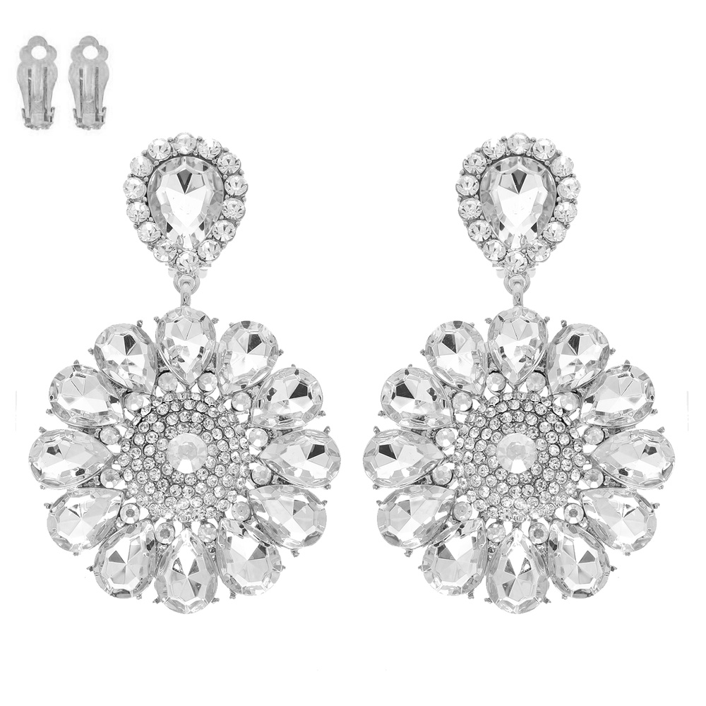 FLORAL TEARDROP MULTI-CUT CRYSTAL RHINESTONE CLUSTER CLIP-ON EARRINGS