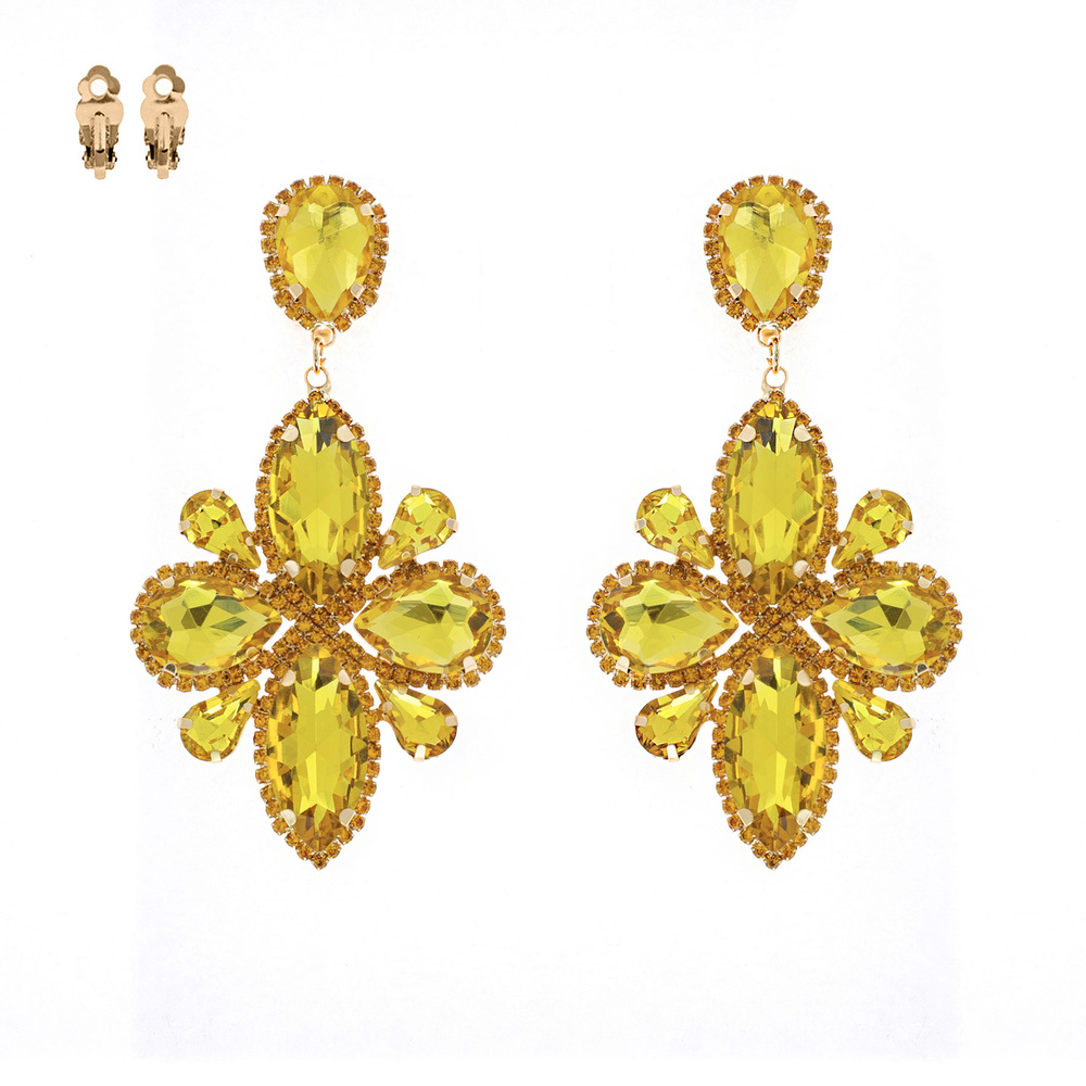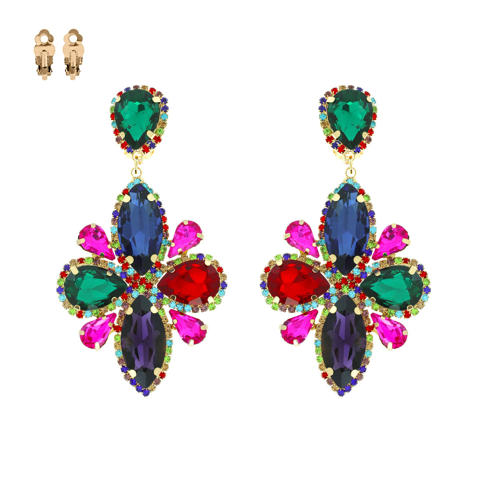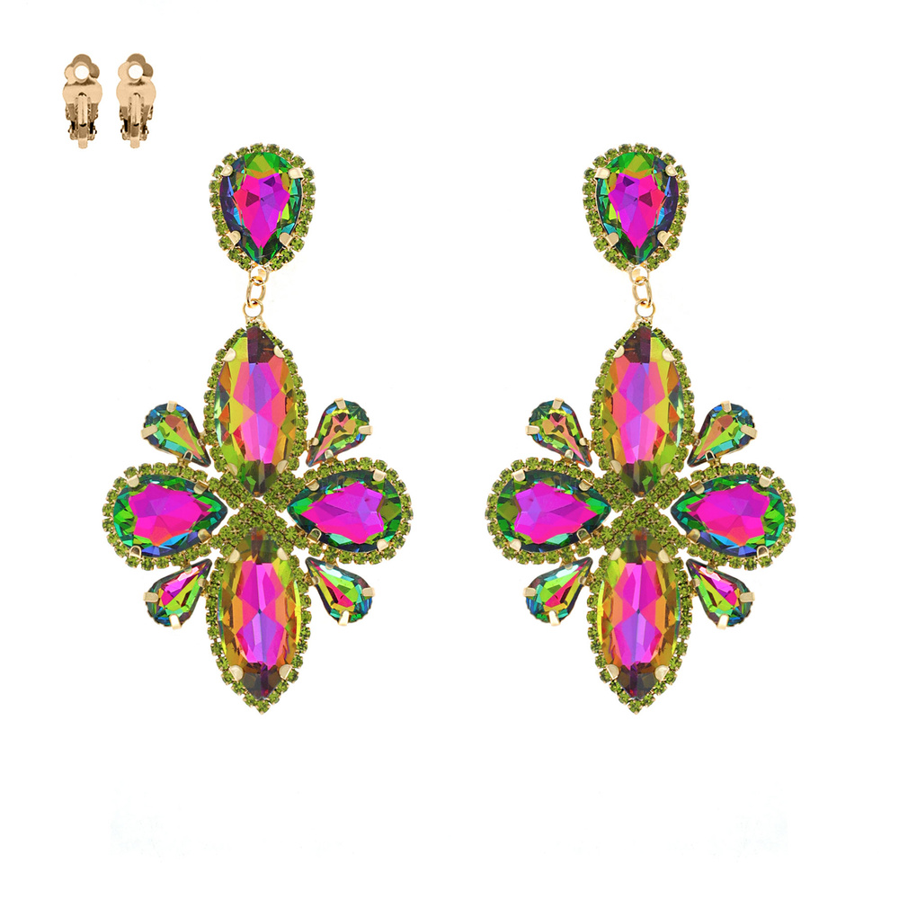 STATEMENT OVERSIZED CRYSTAL GEMS FLOWER CLIP ON DANGLE EARRINGS