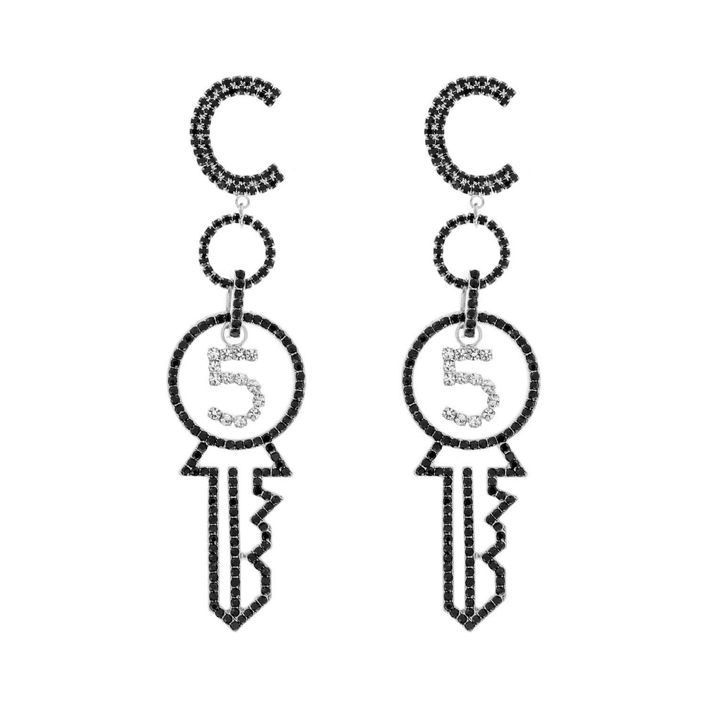 RHINESTONE KEY WITH C NUMBER 5 DANGLE EARRINGS