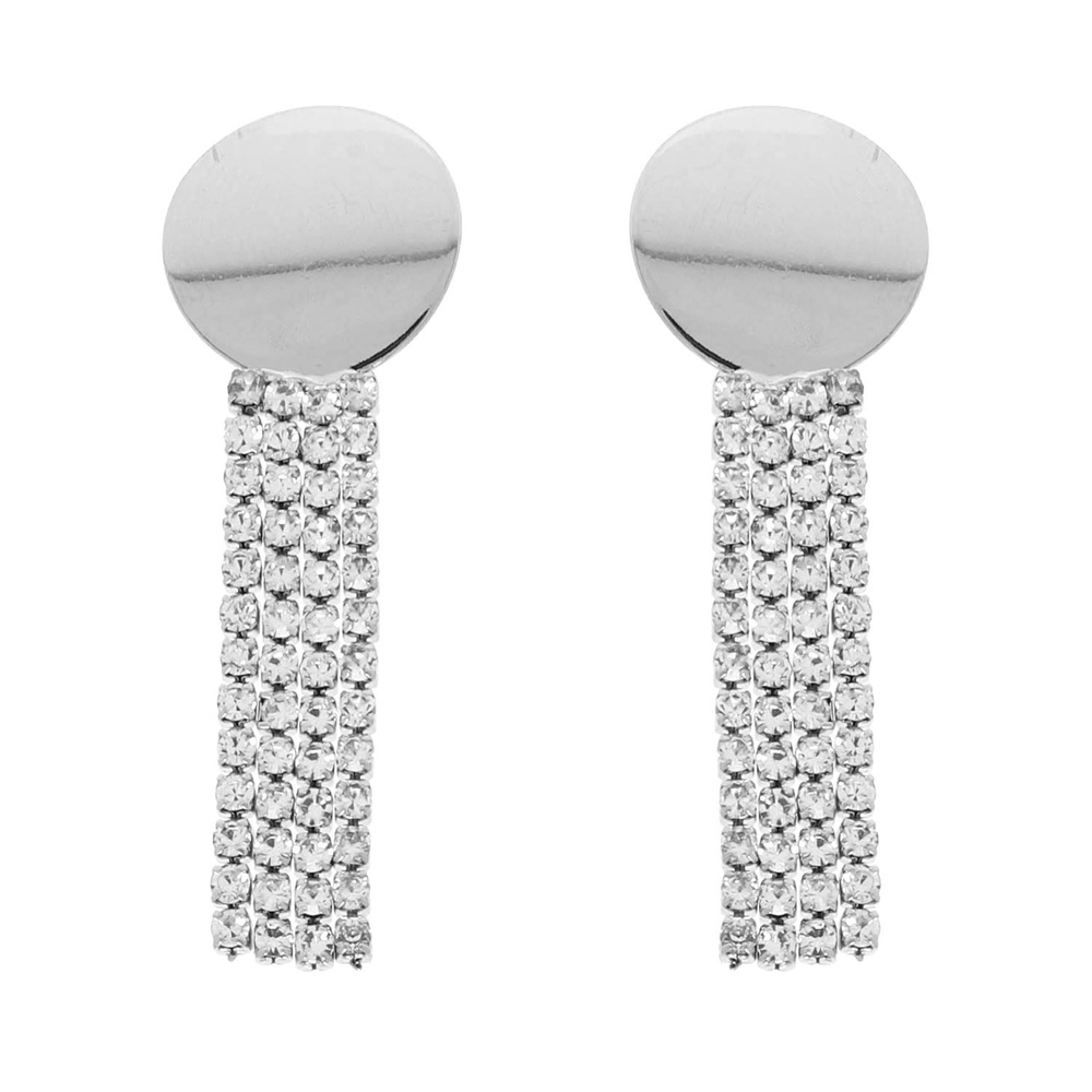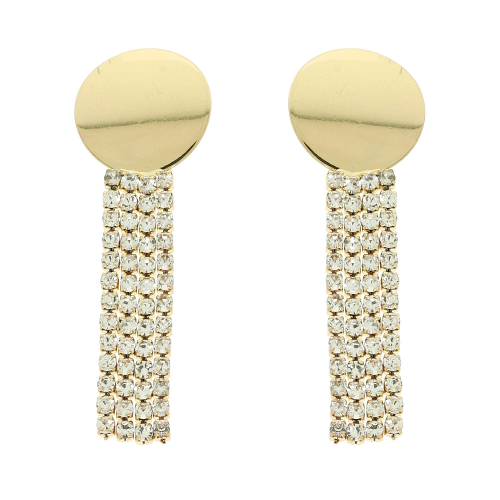 DISC TOP POST EARRINGS WITH MULTI ROW RHINESTONE TASSELS IN GOLD TONE METAL