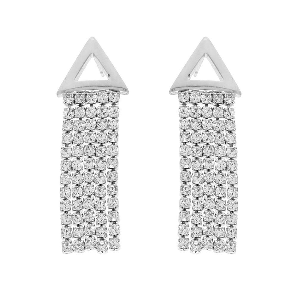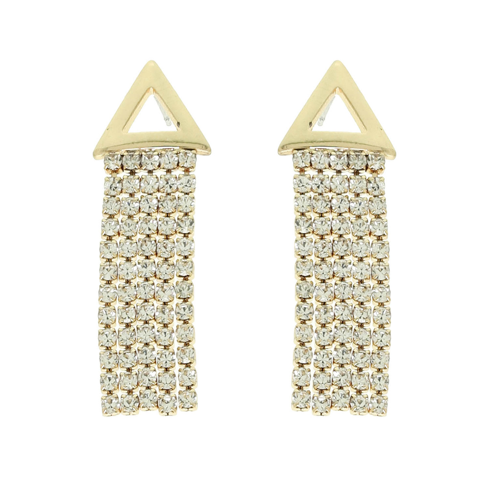 TRIANGLE TOP POST EARRINGS WITH MULTI ROW RHINESTONE TASSELS IN GOLD TONE METAL