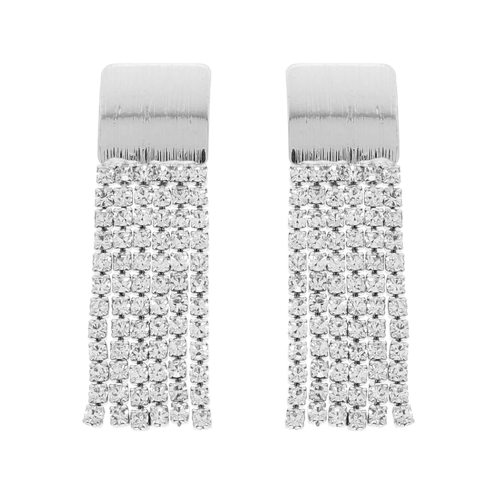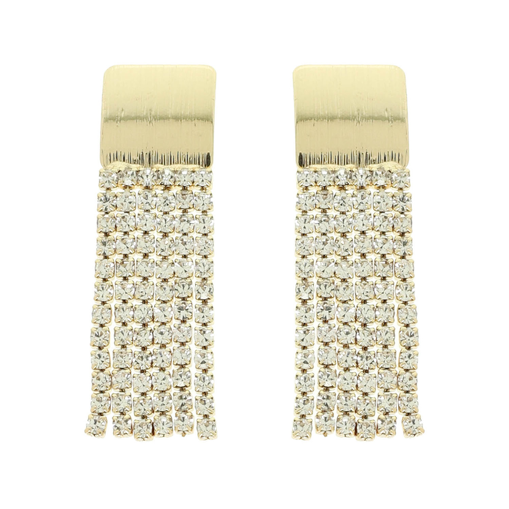 SQUARE TOP RHINESTONE TASSEL POST EARRINGS IN GOLD TONE METAL