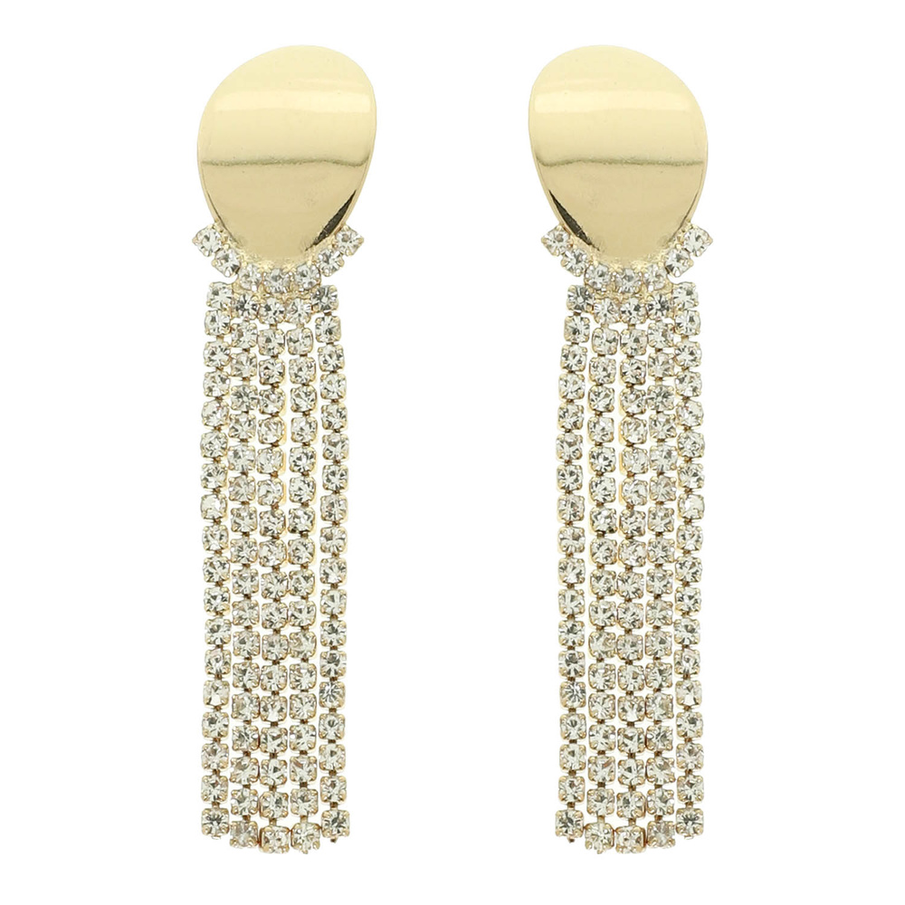 OVAL TOP RHINESTONE TASSEL POST EARRINGS IN GOLD TONE METAL