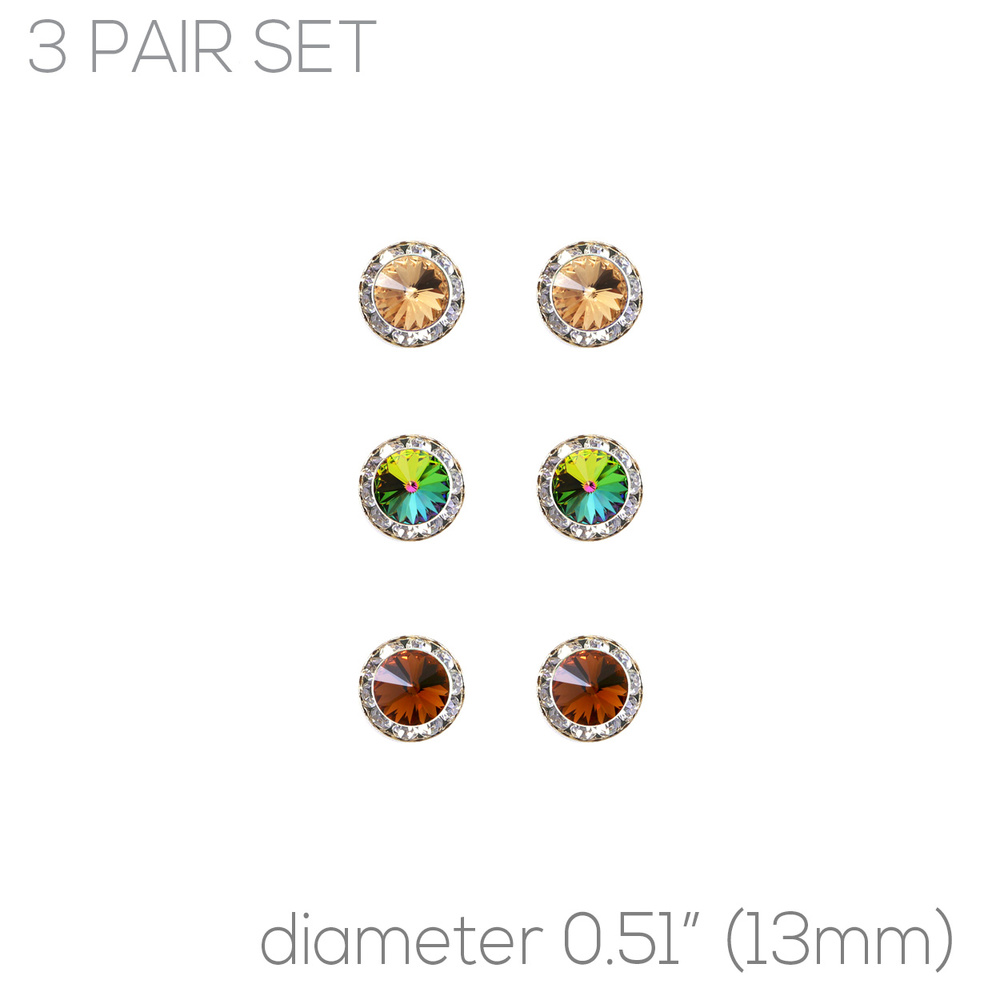 3-PACK MULTI-COLOR SWAROVSKI CRYSTAL RHINESTONE PAVE ROUND ASSORTED BUTTON EARRING SET
