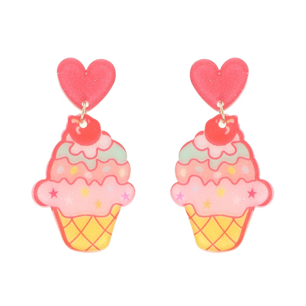 2-TIER HEART POST STRAWBERRY ICE CREAM SUNDAE GLITTER ACRYLIC DANGLE AND DROP EARRINGS