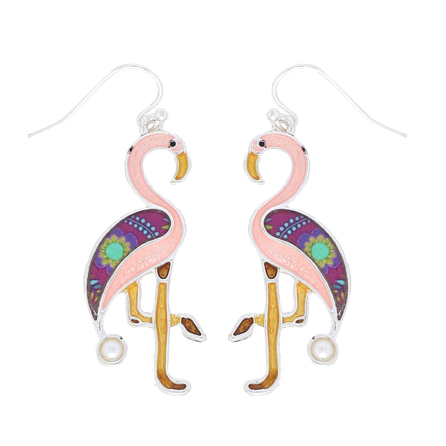 FLORAL PRINT FLAMINGO ENAMEL COATED PEARL ACCENT DANGLE AND DROP HOOK EARRINGS